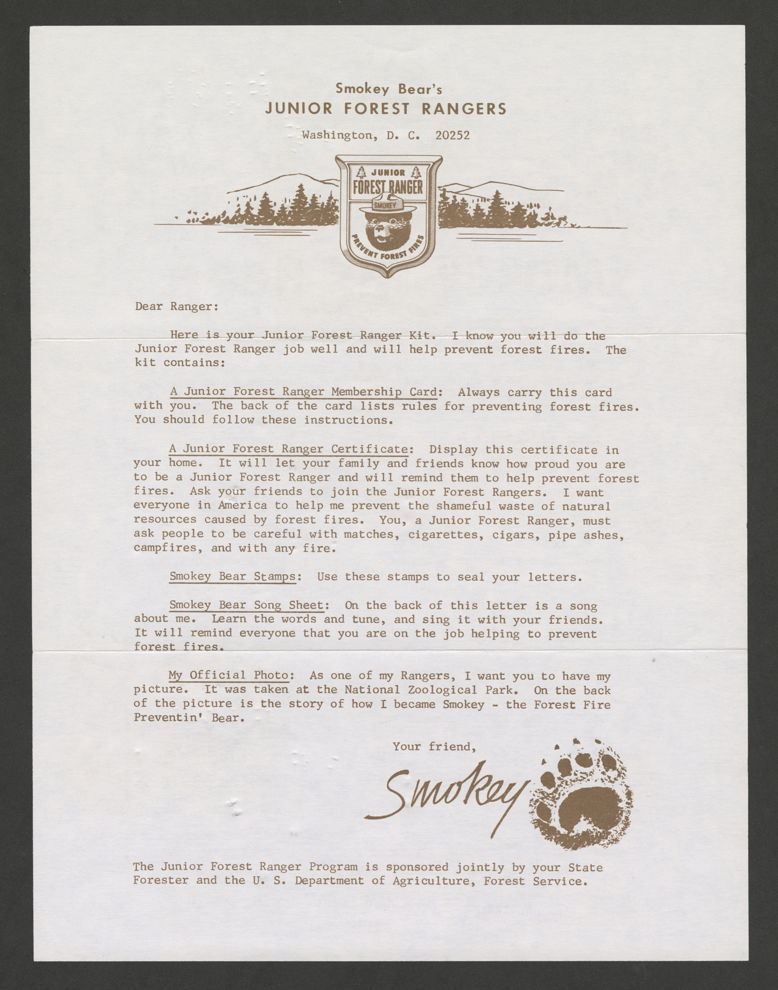 Smokey Bear's Junior Forest Ranger Kit and the Smokey the Bear Song prepared by the U.S. Forest Service as part of the "Only You Can Prevent Forest Fires" public service campaign that highlighted Smokey Bear. The kit included a Junior Forest Ranger membership card and certificate, Smokey Bear stamps, the song sheet, and an official photograph of Smokey. The cover letter was signed with Smokey's signature and paw print. The "Smokey the Bear" song sheet consisted of the score and lyrics written by Steve Nelson and Jack Rollins in 1952.