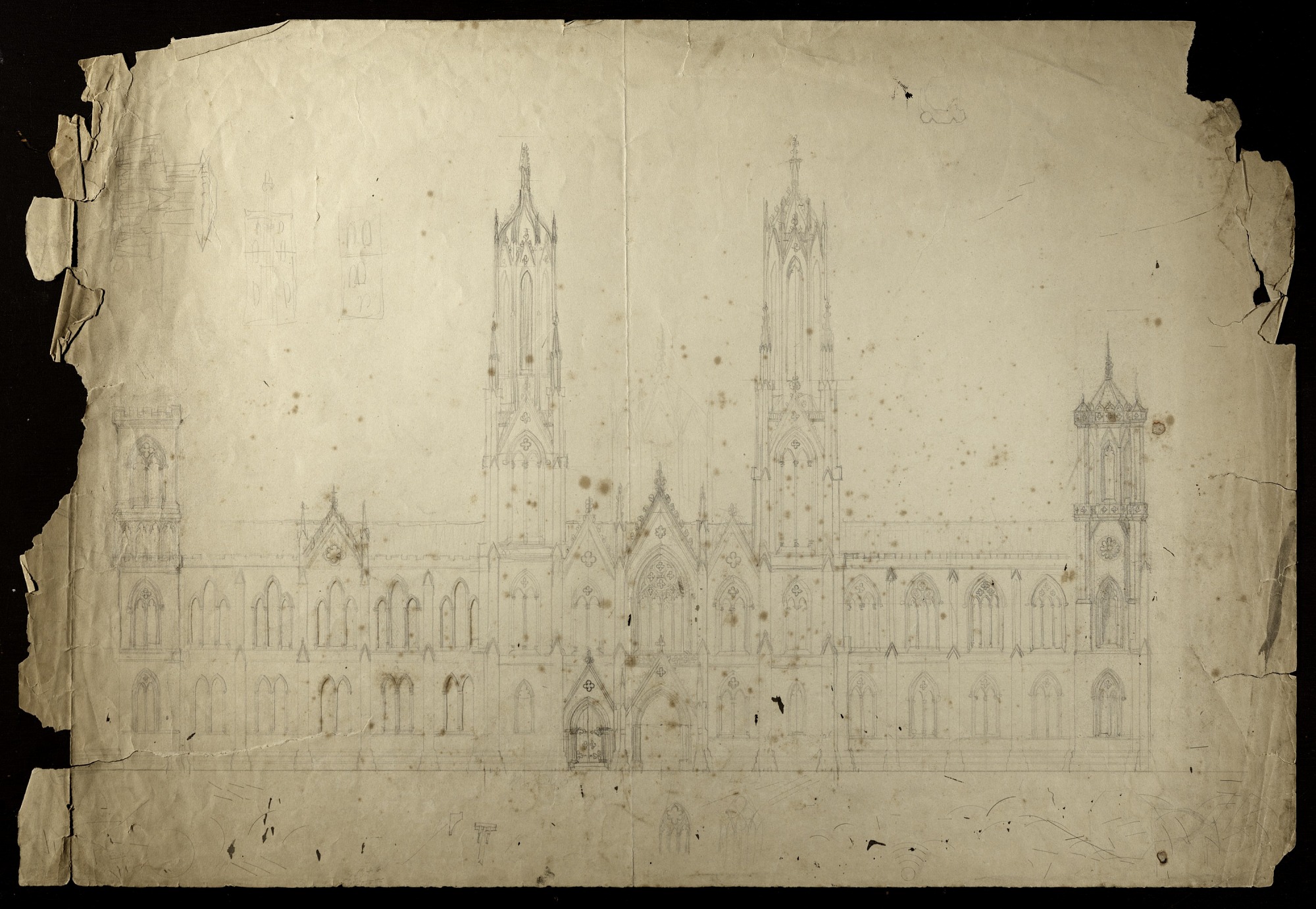 - This drawing depicts the central pavilion of the north fac̦ade of the Smithsonian Institution Building. It is done in pencil on paper by architect James Renwick, Jr., as a developmental study in which he appears to be working out relationships between different architectural elements of the Smithsonian Institution Building, 1846. In this Gothic scheme design, the building's north towers are symmetrical and stand on either side of the north entrance. Smithsonian Institution Archives, negative number SIA2012-1142.