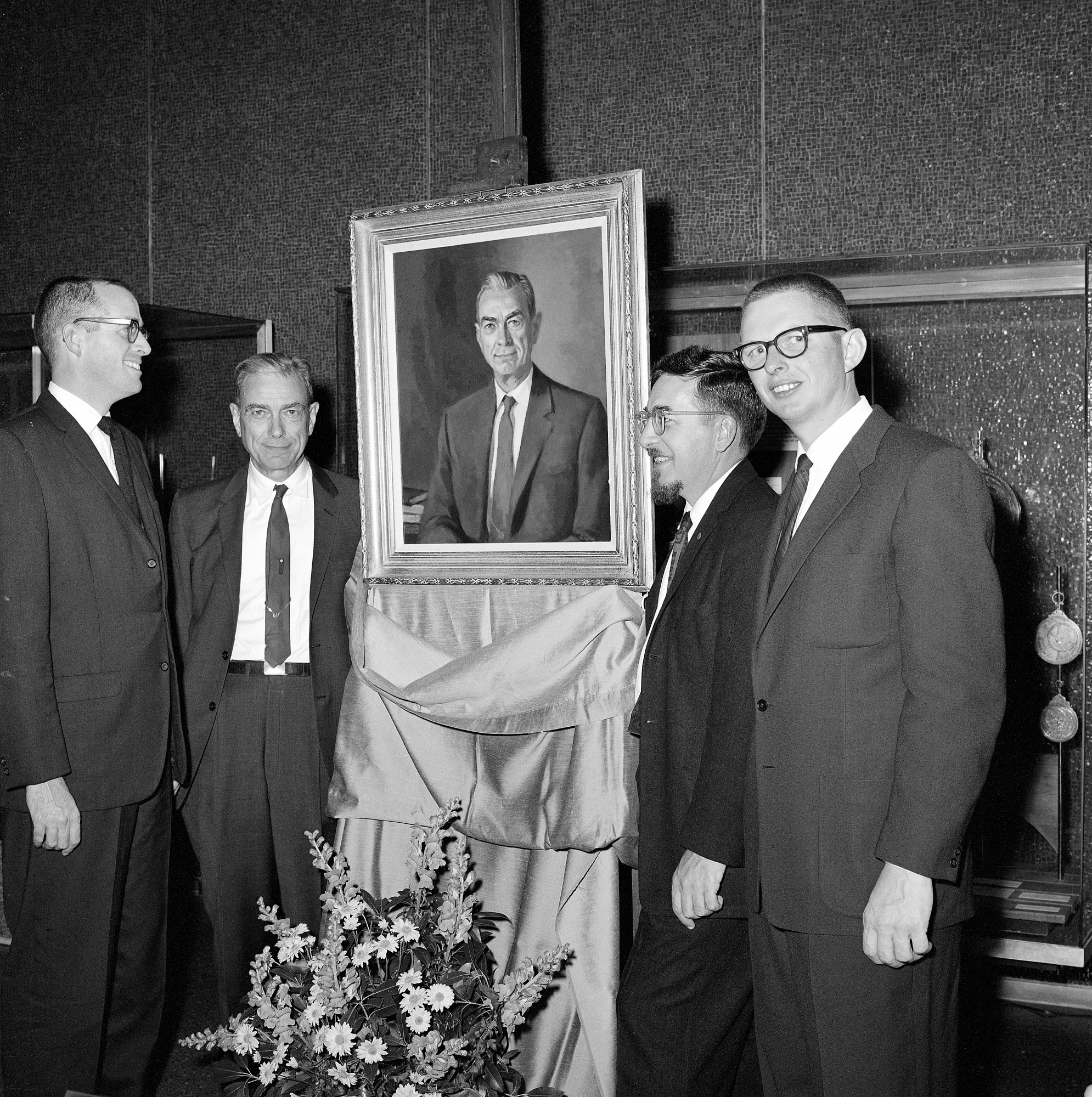 Presentation of portrait painted by Robert Ades of G. Arthur Cooper to the Department of Paleobiology, National Museum of Natural History, at a dinner honoring Cooper on October 28, 1965. L to R: Porter M. Kier, G. Arthur Cooper, Thomas J. Dutro and Richard E. Grant. Portrait now hangs in the Cooper Library of the Natural History Building.