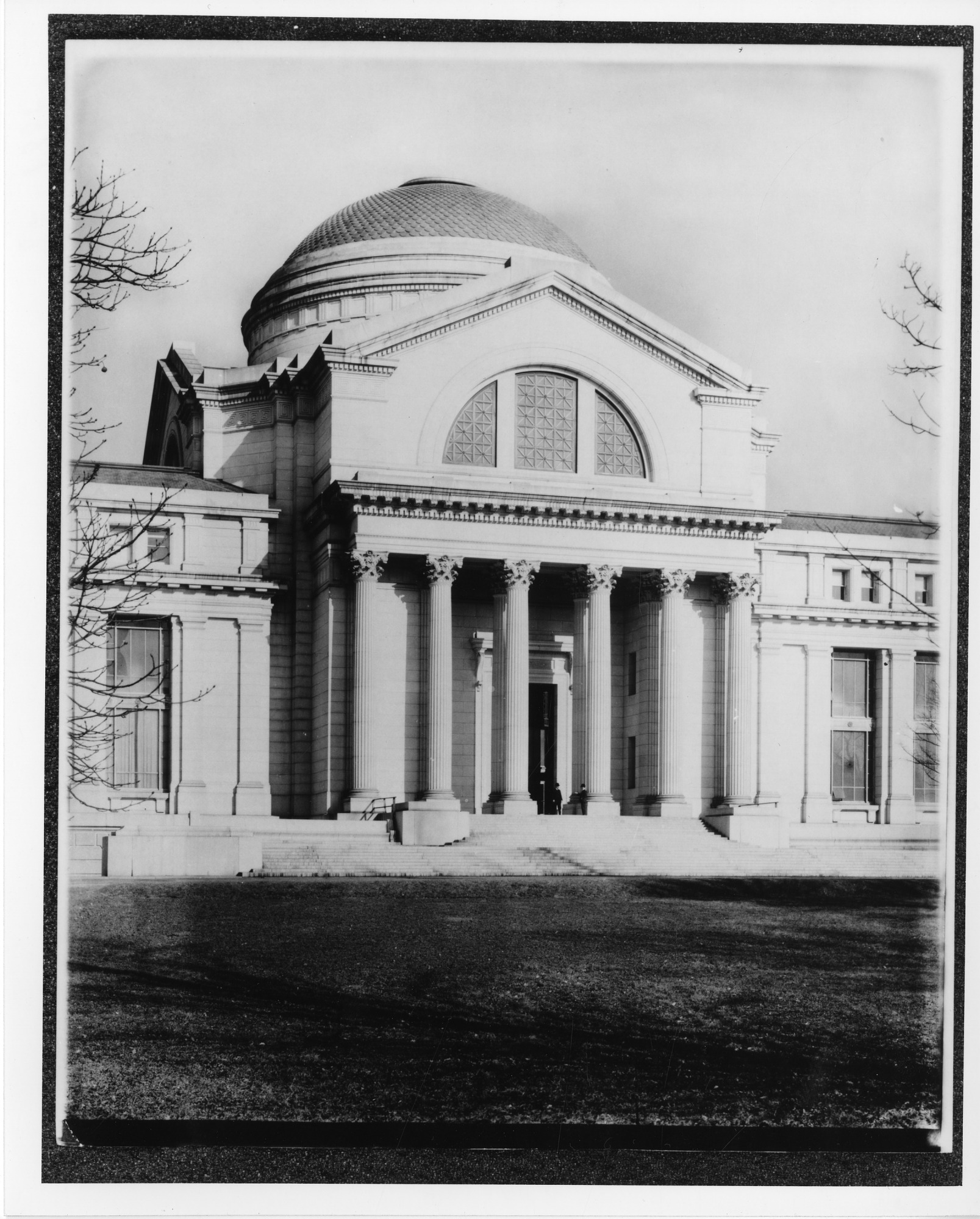 The United States National Museum's, now the National Museum of Natural History, south entrance. This is the side of the museum facing the Mall and is the main entrance to the museum. Two men are standing by the columns at the top of the stairs.