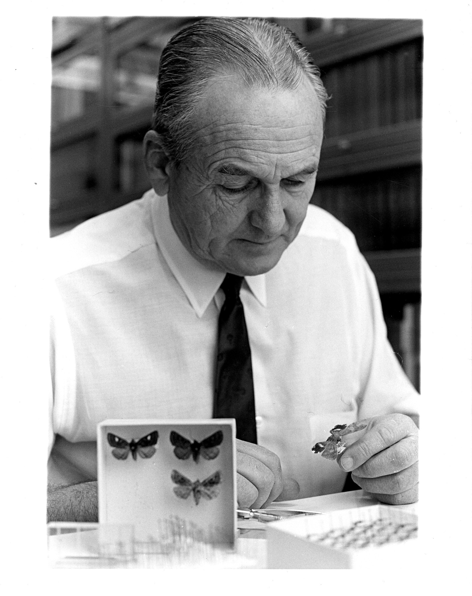 National Museum of Natural History's (NMNH) Entomologist J.F. Gates (John Frederick Gates) Clarke working with the butterfly collection. Clarke was Curator, Division of Lepidoptera, 1954-1963, Chairman, 1963-1965, Senior Entomologist, 1965-1975, and Research Associate, 1976-1990.