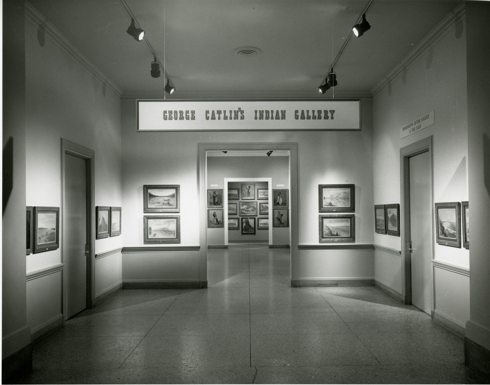 In the Natural History Building, entrance is to "George Catlin's Indian Gallery" in the Art Hall, National Collection of Fine Arts, now known as the Smithsonian American Art Museum. The gallery displayed four hundred George Catlin Indian paintings. The original paintings were acquired by the Smithsonian Institution in 1879 and first exhibited in 1883 in the Smithsonian Institution Building, the "Castle." In the 1900s the majority were placed in the Anthropological Collection from which the paintings for this exhibit were loaned. The paintings were cleaned and renovated to be displayed in this new exhibit, "George Catlin's Indian Gallery," which was shown from July 19 to September 19, 1965, and were mounted "in a setting and manner approximating Catlin's own gallery of the mid-19th century."