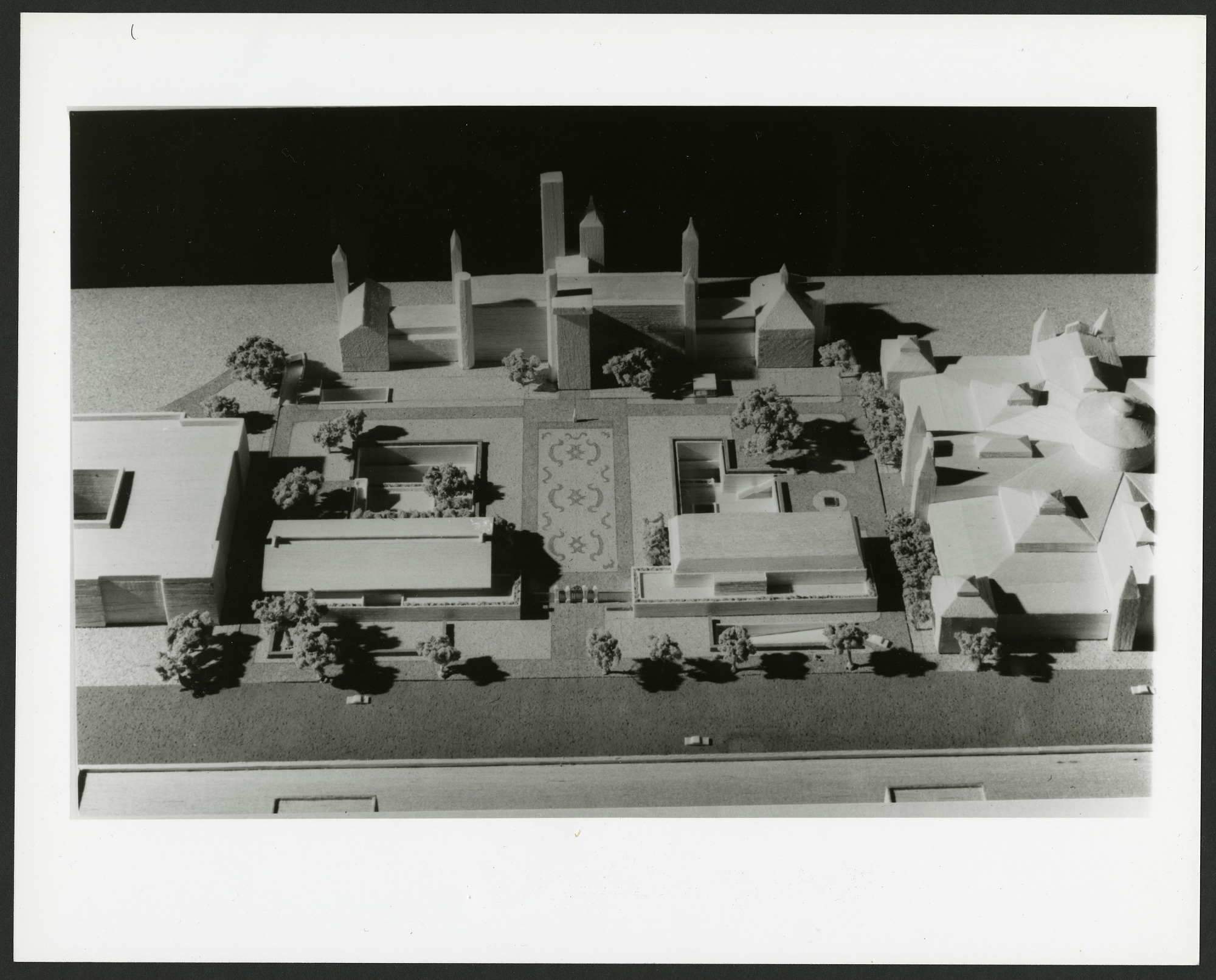 First model for the South Quadrangle project, designed by Junzo Yoshimura. View of model looking north shows Smithsonian Building, Arts and Industries Building, and Freer Gallery framing the two new underground museums. In the proposal each has a sunken court and the Victorian Garden from the Bicentennial remains as a centerpiece.