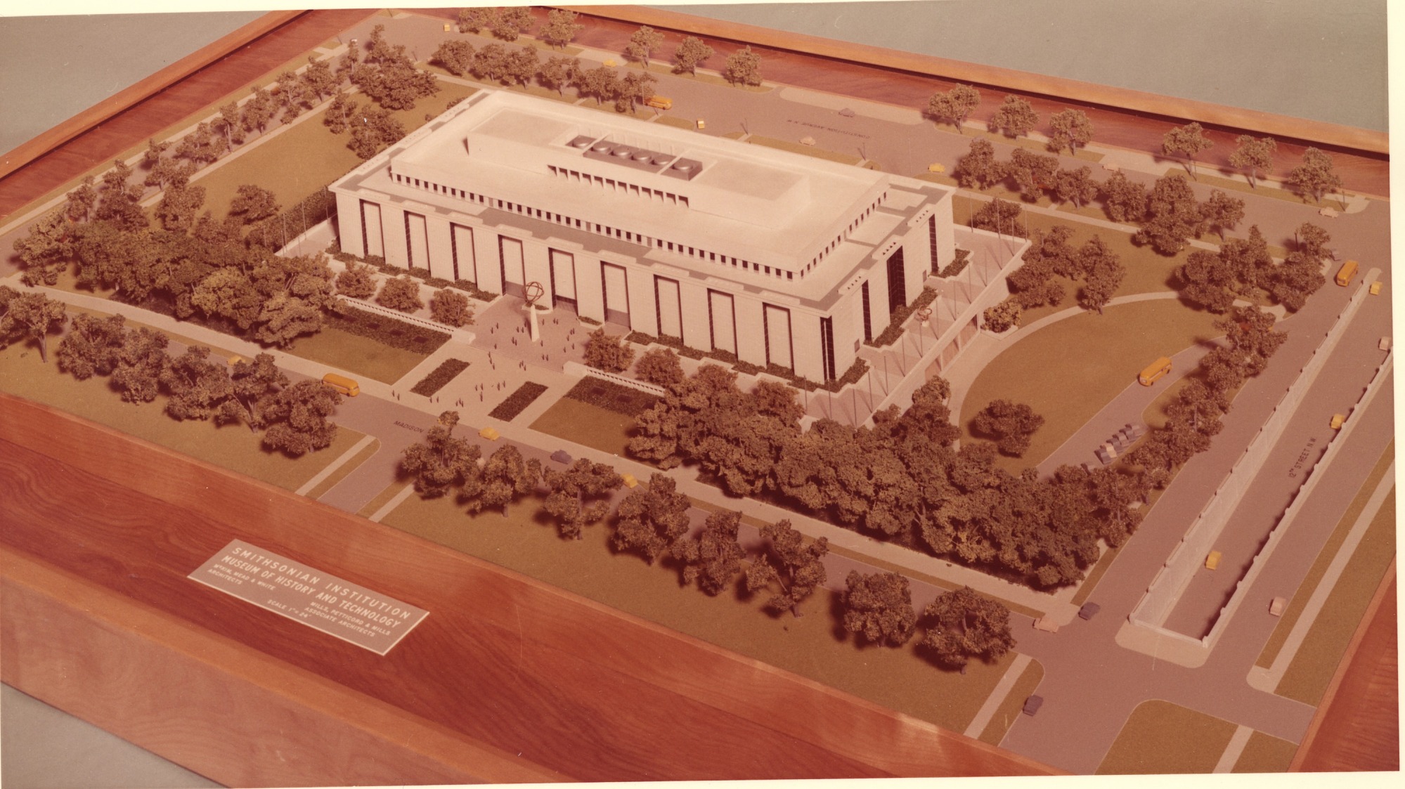Model of the proposed Museum of History and Technology, now the National Museum of American History, designed by the firm McKim, Mead and White (and the successor firm Steinmann, Cain, and White). Photo shows the south or National Mall facade of the building. The plaque reads "Smithsonian Institution Museum of History and Technology, McKim, Mead & White Architects, Mills, Petticord & Mills, Associate Architects. Scale 1" x 24'."