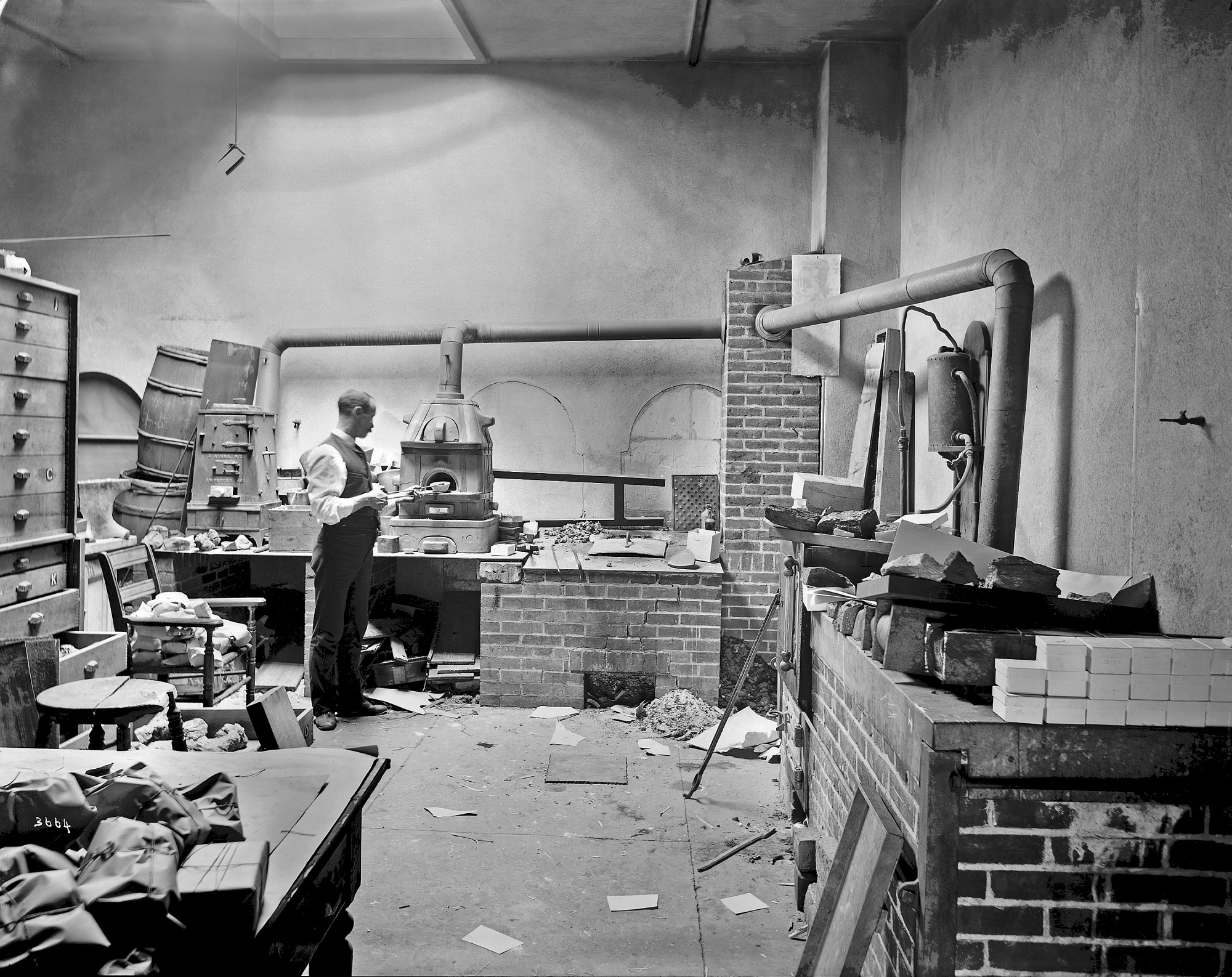 A man working in the Mineralogy Laboratory on the 3rd floor of Southwest Pavilion of the United States National Museum, now the Arts and Industries Building.