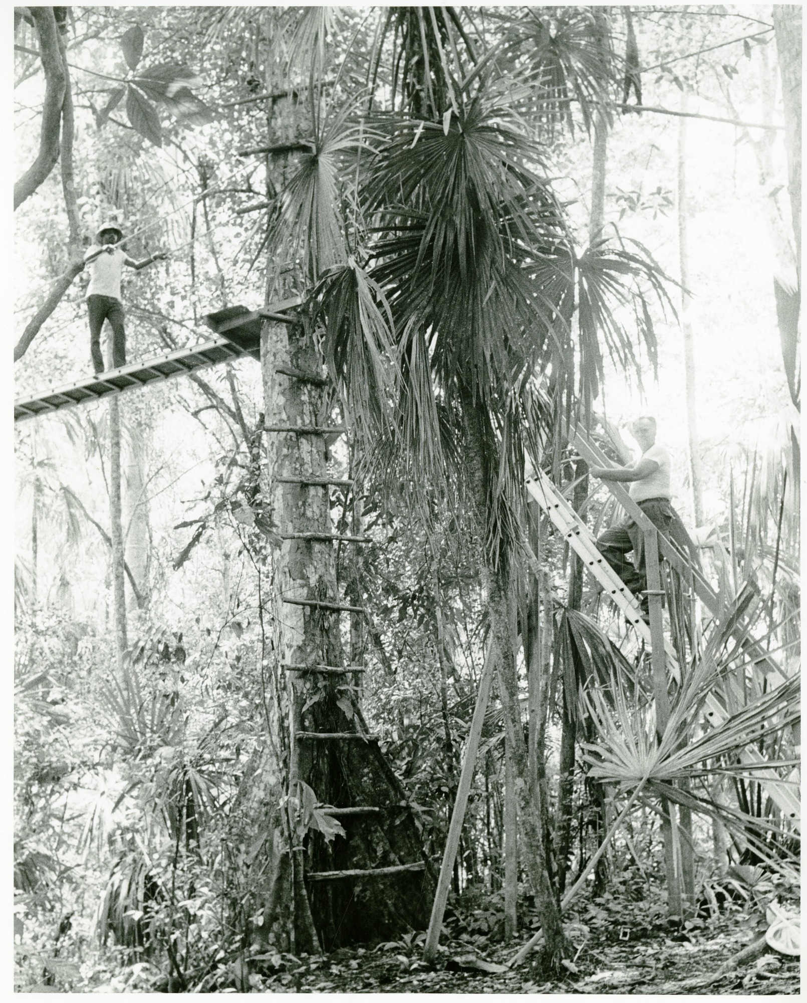 A canopy bridge in the Bayano River Basin in Panama named the Alexander Wetmore Bridge in honor of ornithologist and sixth Secretary of the Smithsonian Alexander Wetmore. The photograph shows span of the bridge through the trees. There are two unidentified men in the photo standing on the bridge. This bridge is used to trap and band birds in the high canopy of the trees.