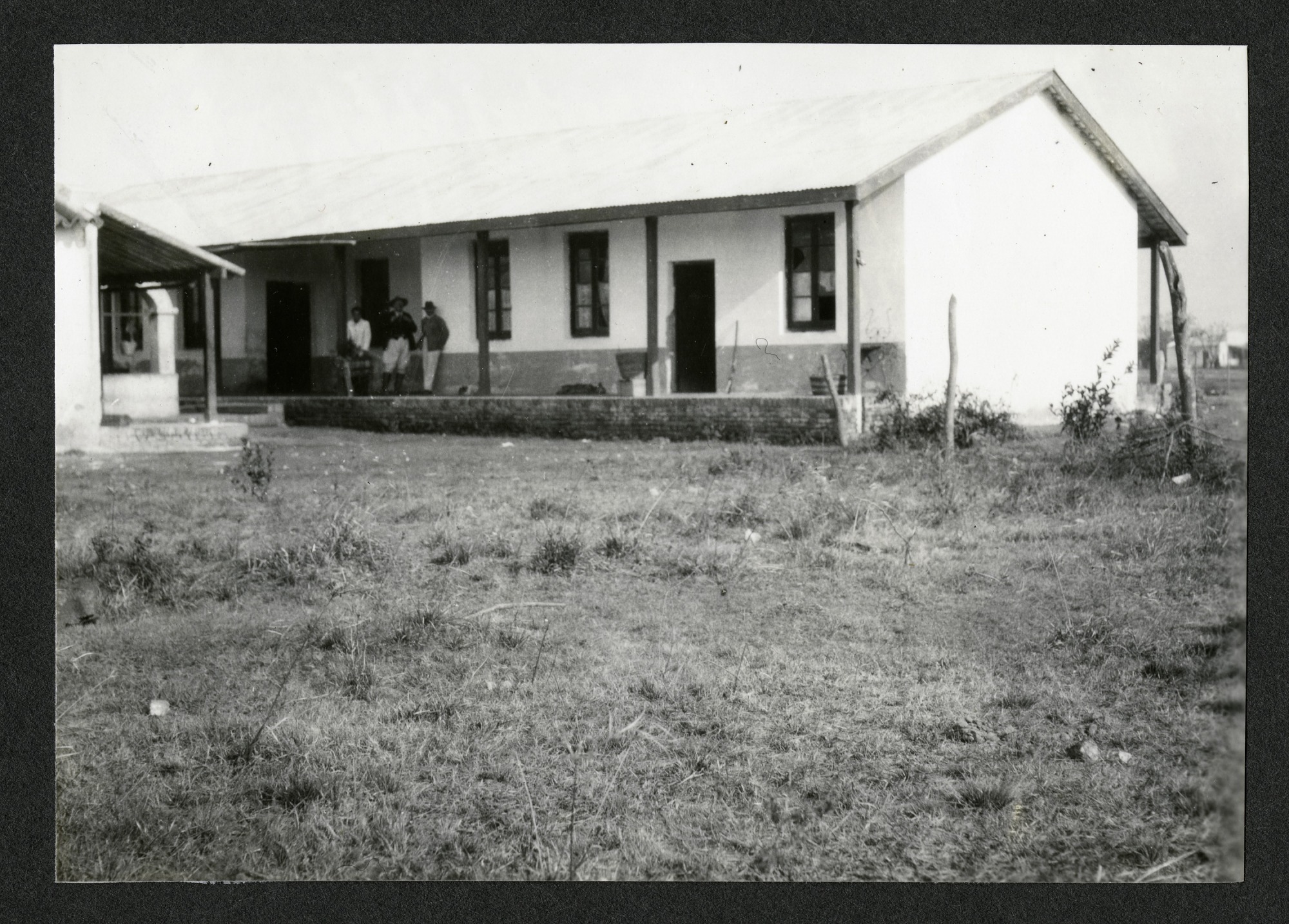 Photograph of Alexander Wetmore's quarters at the fonda, a eating and/or drinking establishment, in Las Palmas, in Chaco, Argentina. Visible in this image is the large white house where Wetmore stays during his field work in this area, as well as three unidentified men on the front porch. This photograph was taken by Alexander Wetmore, noted ornithologist and sixth Secretary of the Smithsonian Institution, 1944-1952, while conducting field work for the United States Bureau of Biological Survey throughout the islands of the Caribbean and various Latin American countries.