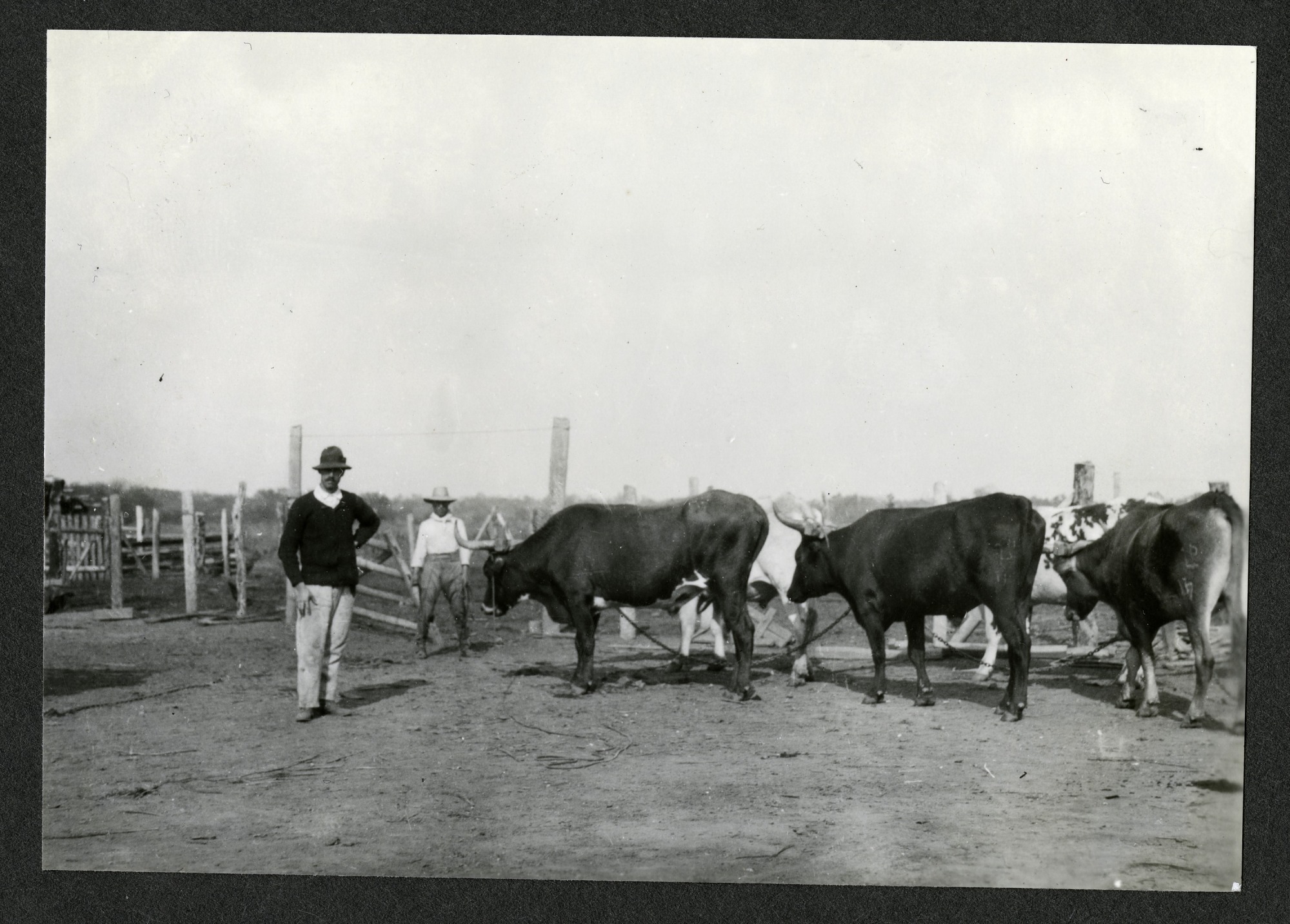 Don Pedro Upitz is seen here standing with his work cattle in a corral at Hacienda Linda Vista in Riacho Pilaga, Argentina on August 10, 1920. This photograph was taken by Alexander Wetmore, noted ornithologist and sixth Secretary of the Smithsonian Institution, 1944-1952, while conducting field work for the United States Bureau of Biological Survey throughout the islands of the Caribbean and various Latin American countries.