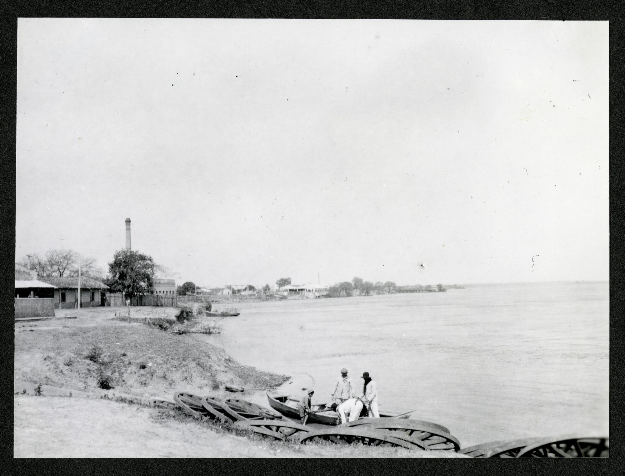Waterfront of the Rio Paraguay in Villa Concepcion in Paraguay on August 30, 1920. Several unidentified men are visible gathered around a small boat on the water's edge. Various buildings are seen in the distance on the river's shore. This photograph was taken by Alexander Wetmore, noted ornithologist and sixth Secretary of the Smithsonian Institution, 1944-1952, while conducting field work for the United States Bureau of Biological Survey throughout the islands of the Caribbean and various Latin American countries.