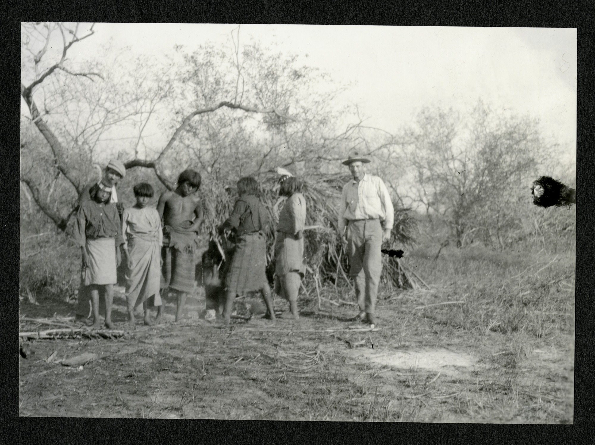 Alexander Wetmore standing (far right) with six men, women, and children Lengua Indians in his field camp at Laguna Wall, Kilometro 200, west of Puerto Pinasco, Paraguay on September 25, 1920. Alexander Wetmore, noted ornithologist and sixth Secretary of the Smithsonian Institution, 1944-1952, while conducting field work for the United States Bureau of Biological Survey throughout the islands of the Caribbean and various Latin American countries.