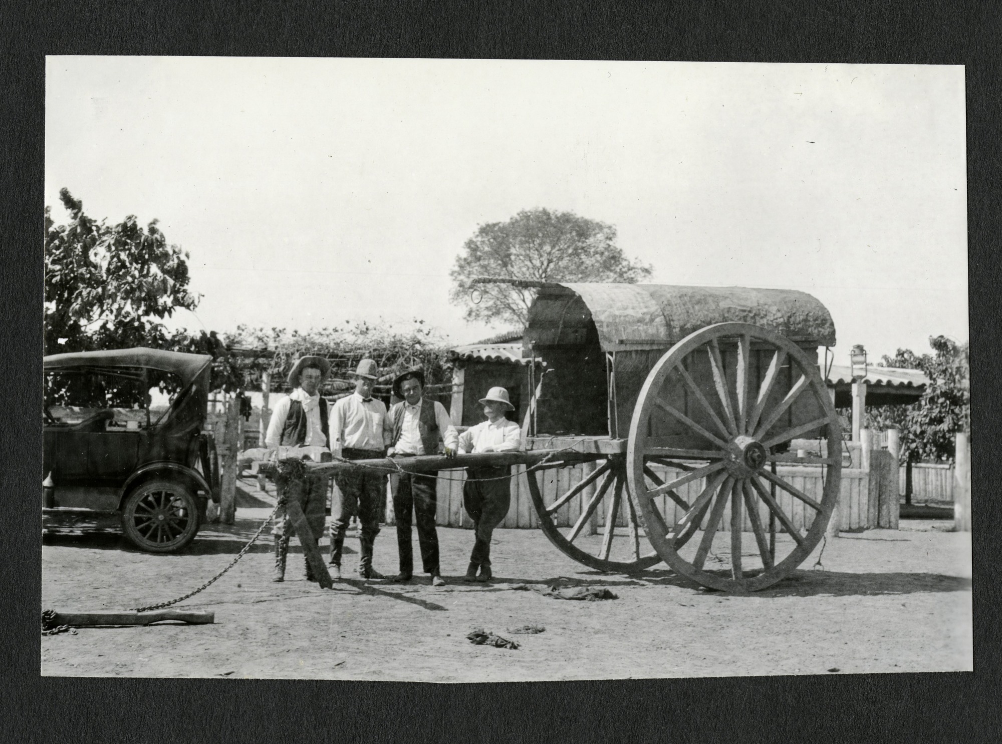 Carl Hettman, Frank Branson, Fred Hettman, F. Engen, standing with a typical ox cart at Kilometro 80, Puerto Pinasco, Paraguay. A car and a fenced in structure are visible behind them. This photograph was taken by Alexander Wetmore, noted ornithologist and sixth Secretary of the Smithsonian Institution, 1944-1952, while conducting field work for the United States Bureau of Biological Survey throughout the islands of the Caribbean and various Latin American countries.