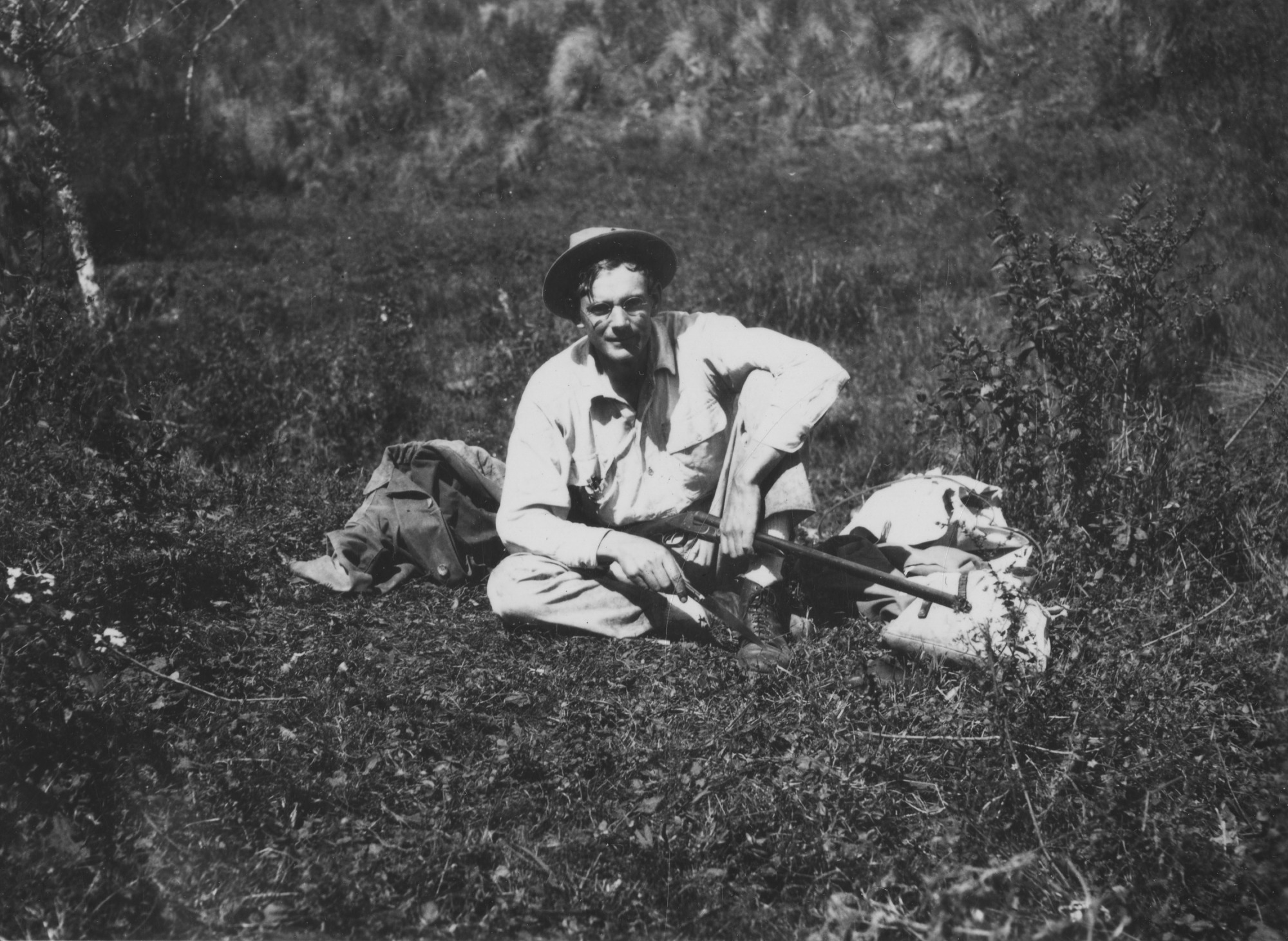 Alexander Wetmore sitting on the ground in a field on Sierra San Xavier, at 7,500 foot elevation above Tafi Viejo at Tucuman, Argentina on April 17, 1921. He is holding a knife in his right hand and a rifle is lying in his lap. Wetmore was working for the Bureau of Biological Survey on this trip. Wetmore, noted ornithologist and sixth Secretary of the Smithsonian Institution from 1944-1952, conducted extensive fieldwork throughout the islands of the Caribbean and various Latin American countries.