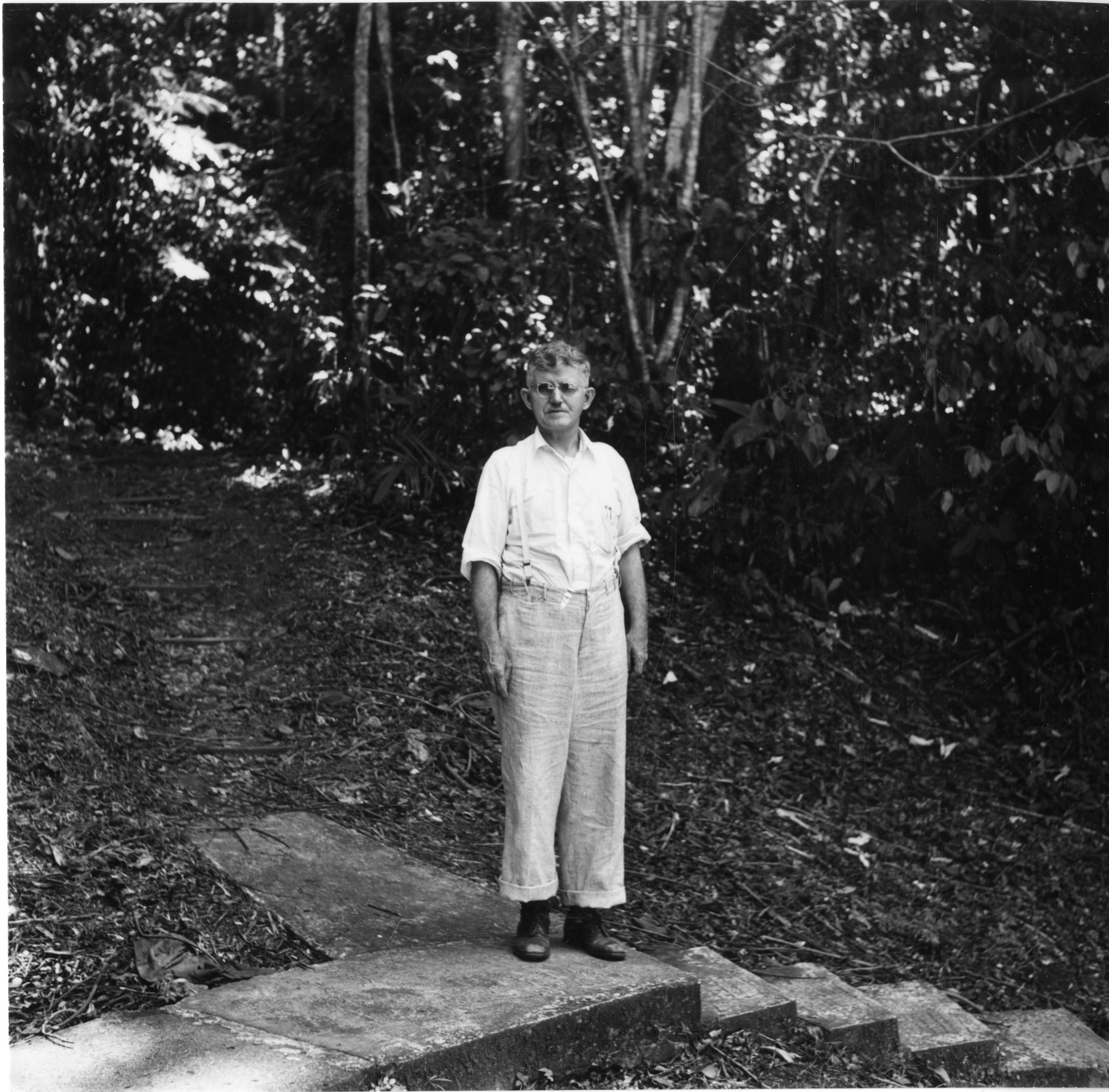 Dr. James Zetek (1886-1959), entomologist and founding director of the Canal Zone Biological Area (CZBA), standing in front of one of the CZBA buildings on Barro Colorado Island, Canal Zone, Panama. The CZBA became part of the Smithsonian in 1946 and was later renamed the Smithsonian Tropical Research Institute. The image was taken by Alexander Wetmore, sixth Smithsonian Secretary and ornithologist, while conducting scientific research in the area.