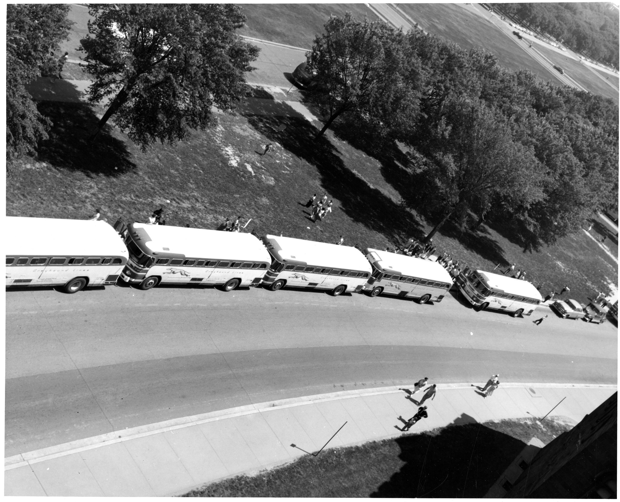 Taken from one of the towers of the Smithsonian Institution Building, a view of Greyhound buses lined up on Thomas Jefferson Drive, S.W., on the National Mall in front of the Smithsonian Institution Building. People are walking on the sidewalk in front of the "Castle."