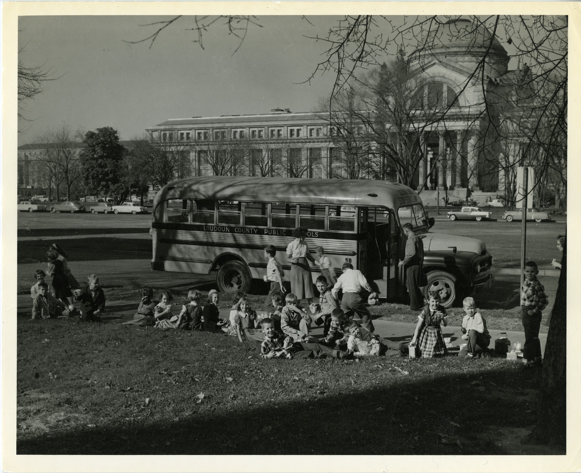 On the National Mall in front of the National Museum of Natural History, school children sit on the grass having their lunch. Their school bus from Loudoun County Public Schools is parked behind them. Cars are parked along Washington Drive, N.W. and Madison Drive, N.W.
