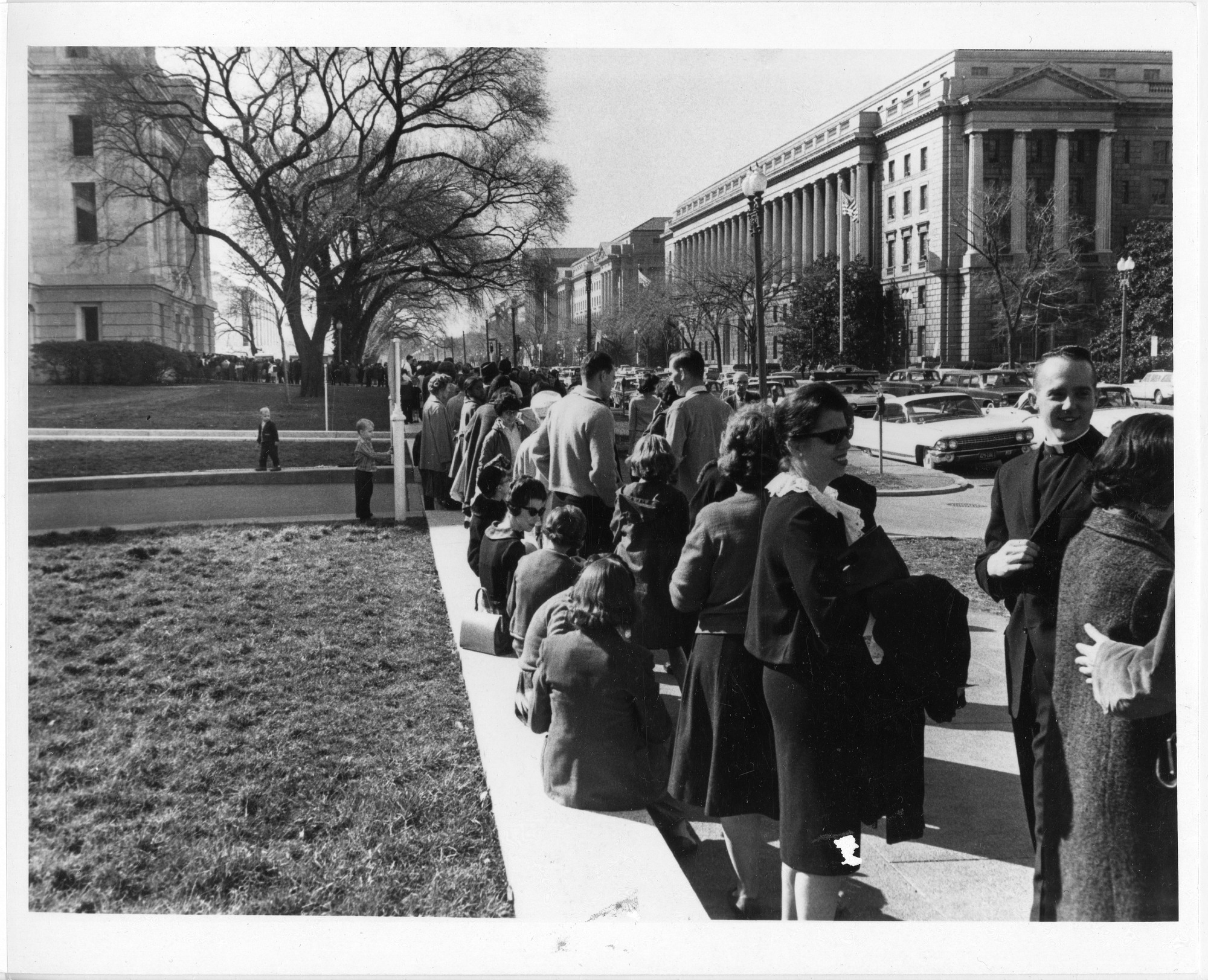 Visitors line up along Constitution Avenue to see the "Dead Sea Scrolls" exhibit, part of the National Collection of Fine Arts, now the Smithsonian American Art Museum, in the foyer of the National Museum of Natural History, March 1965. The exhibit ran from February 27 - March 21 of 1965. The exhibit drew approximately 209,643 visitors.