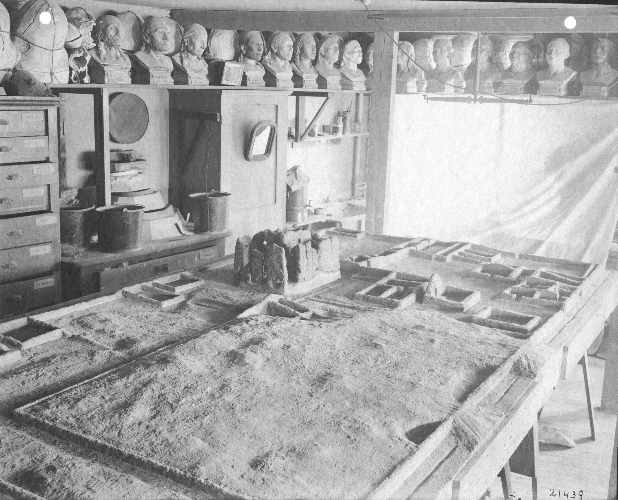 United States National Museum (now the Arts and Industries Building) work and storage area with the Casa Grande (Arizona) ruins model under construction. Busts are on a shelf near the ceiling. There are also storage cases and equipment. The model despicts the ruins of the Great House found in Arizona and built by the Sonoran Desert people.