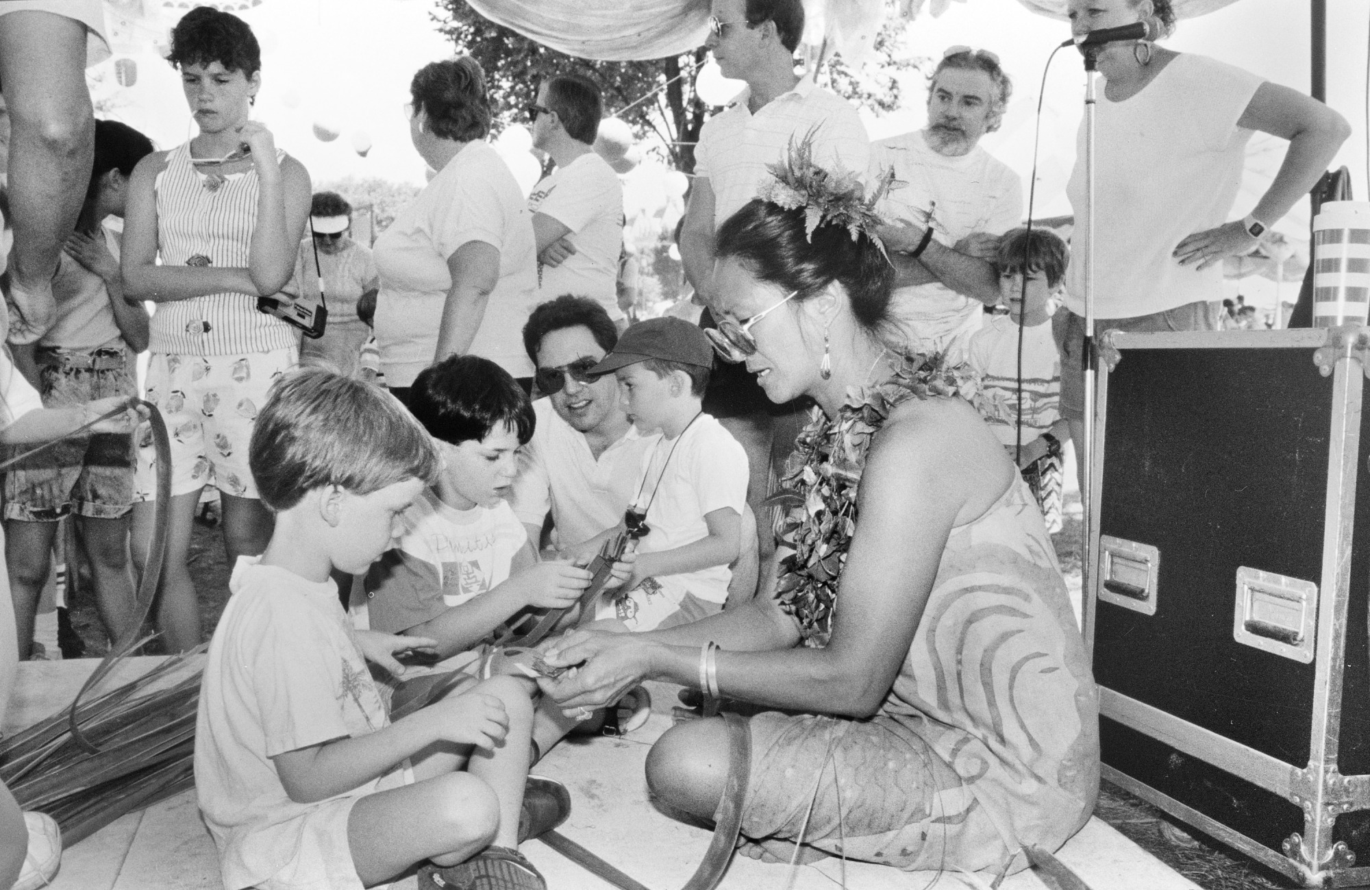 At the 1989 Festival of American Folklife, visitors look on as a participant from Hawaii demonstrates crafts to children.