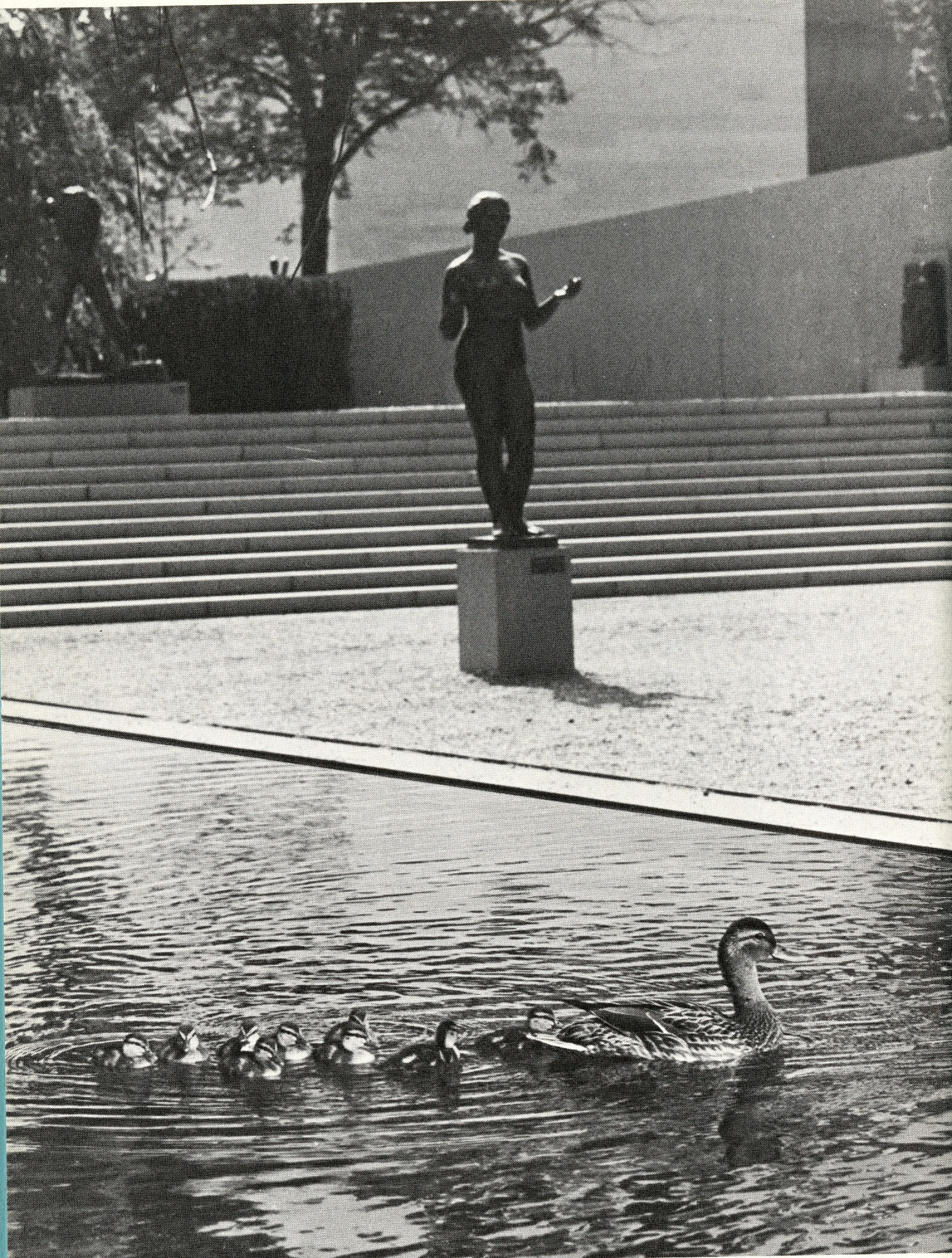 Visitors to the Hirshhorn Museum and Sculpture Garden in June not only saw Aristide Maillol's Nymph but also this wild mallard duck, proudly swimming with her young. A pair of mallards surprisingly had made the garden their home.