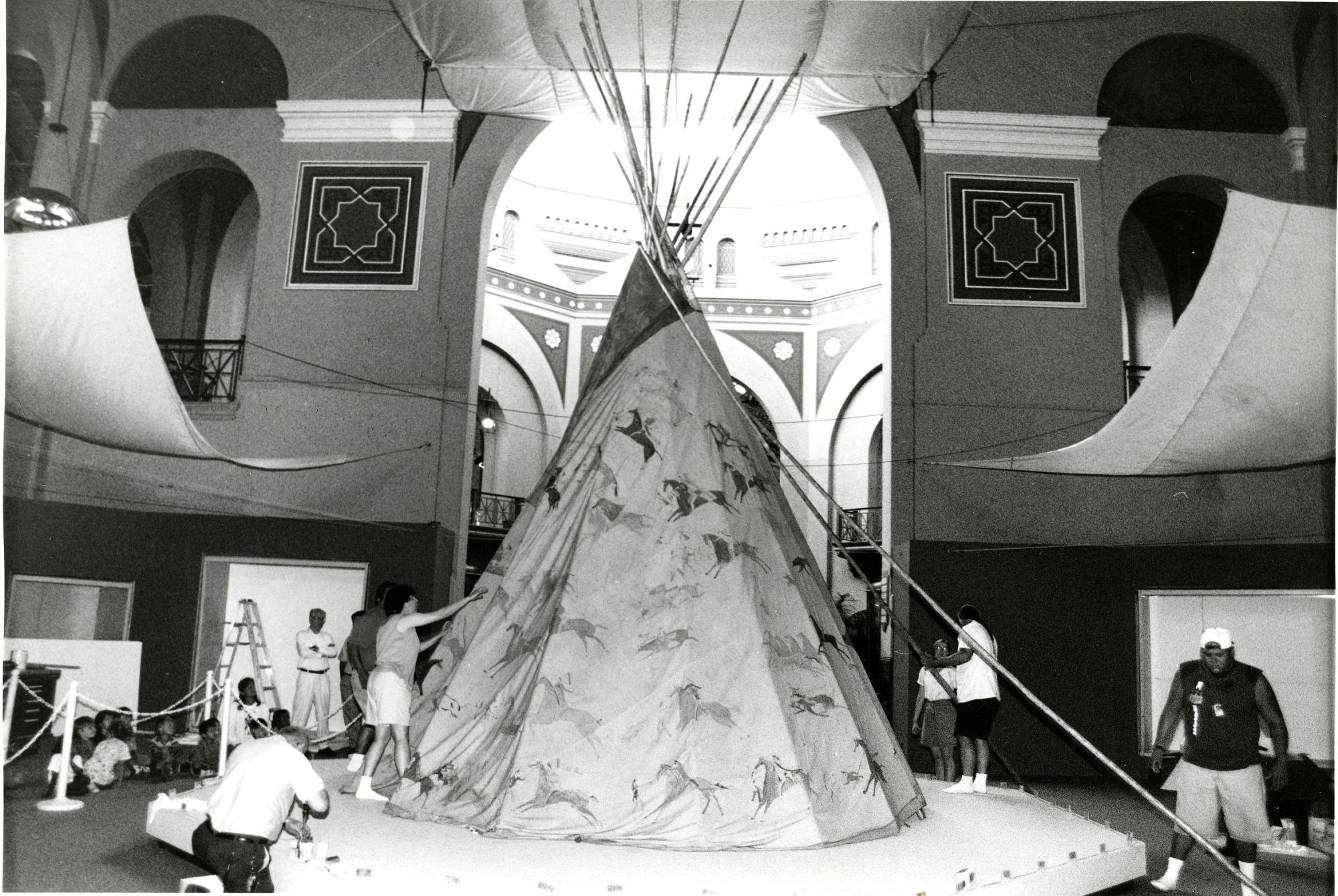The National Museum of the American Indian and Exhibits Central staff install a Dakota tepee (circa 1910) in the North Hall of the Arts and Industries Building for a special exhibition titled "Stories of the "People". Children are sitting on the floor watching. This was a preview of the National Museum of the American Indian to be built on the National Mall.