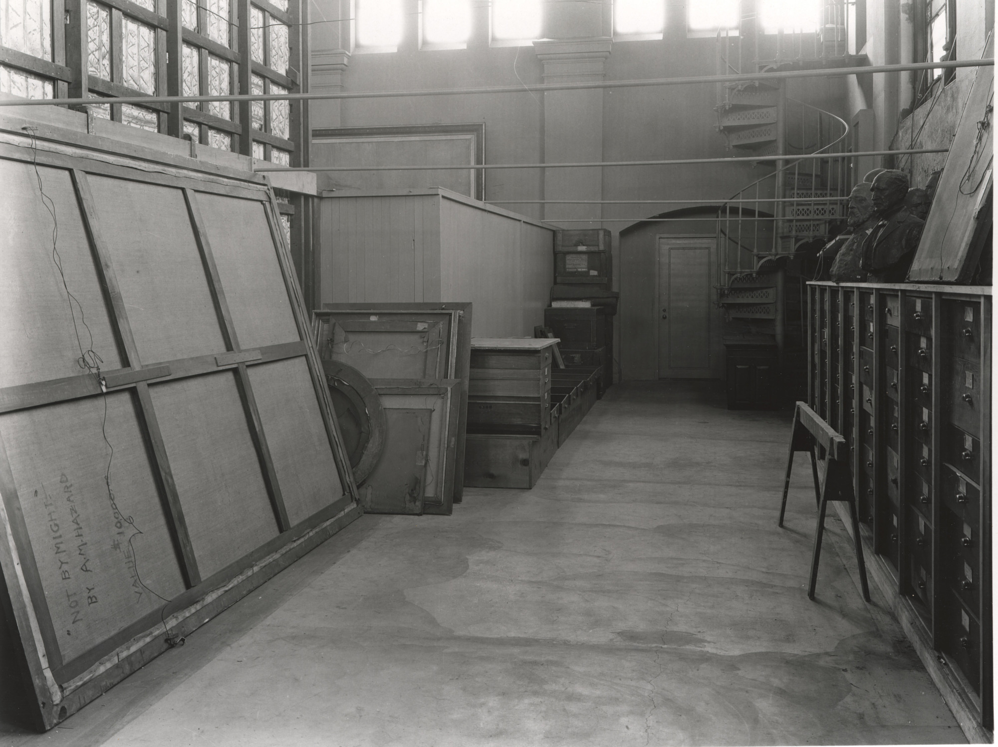 A storage area on the balcony at the end of North Hall in the United States National Museum, now the Arts and Industries Building. Along the outside wall under the windows is a row of storage cabinets with busts and other objects sitting on top of them. Along the wall that would overlook the hall below, there are paintings leaning against it. The largest of the paintings has written on the back "'Not By Might' by A. M. Hazard, value $10,000.00."