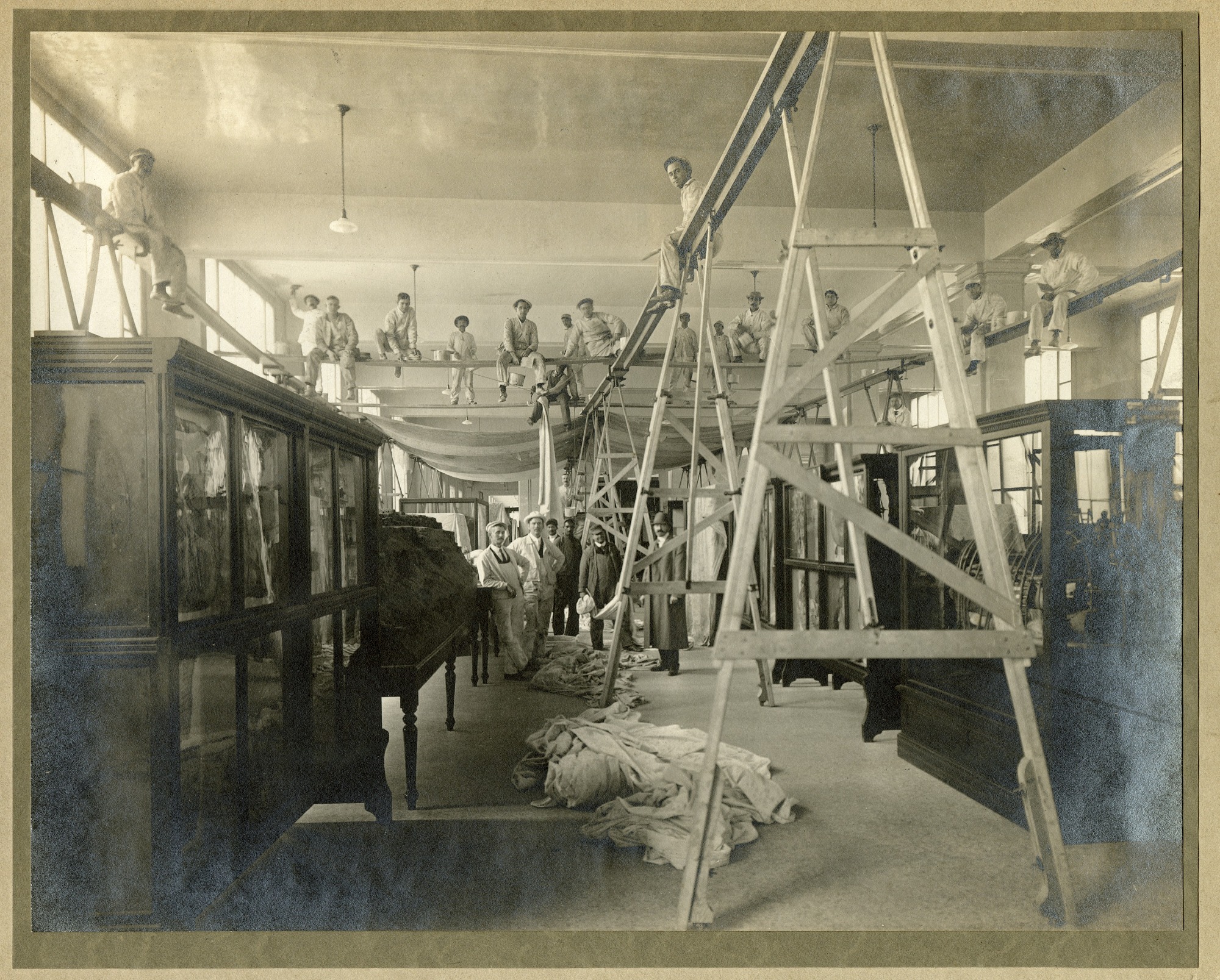 Painters sitting boards on top of wooden scaffolding painting the ceiling of a wing of the new United States National Museum, now the National Museum of Natural History, building soon after it was finished being built. Exhibit cases are beneath the painters. This view is from the floor looking up.