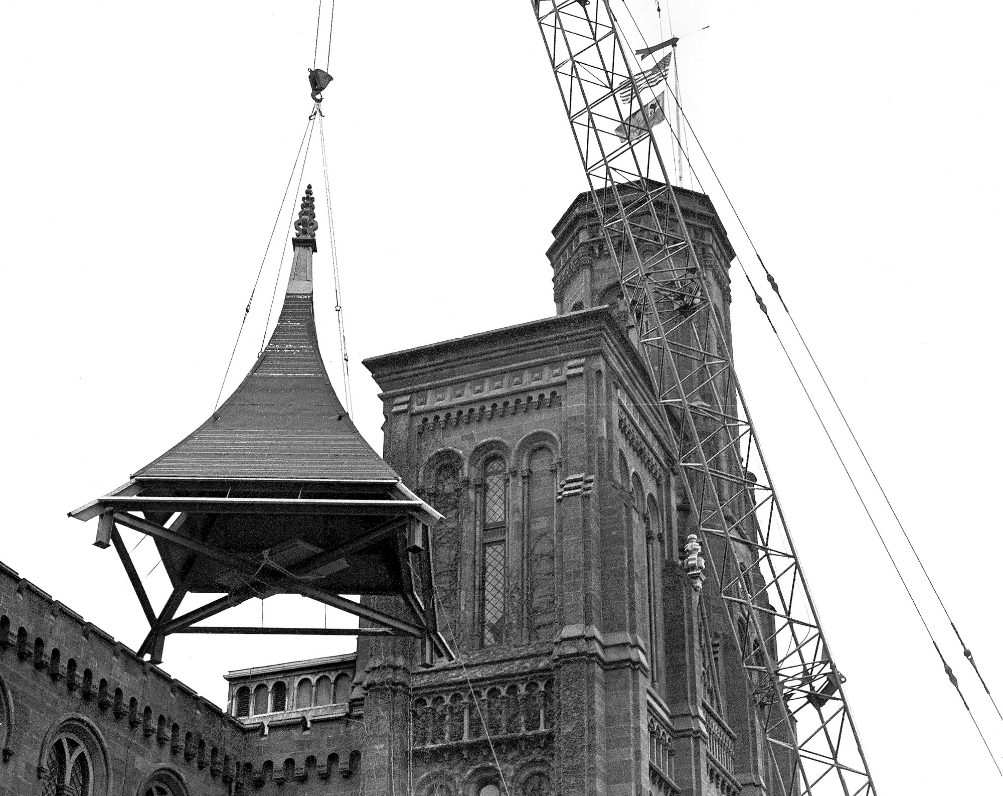 The new cap for the lower North Tower of the Smithsonian Institution Building is being raised into position by a crane. The original roof was destroyed in the fire of January 24, 1865.