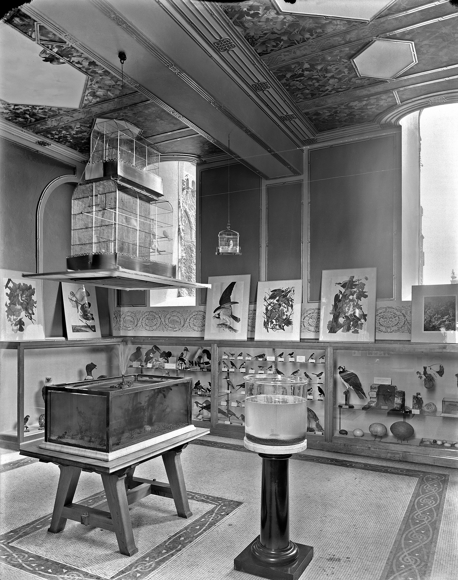The Children's Room in the South Tower of the Smithsonian Institution Building, was created by third Secretary Samuel P. Langley (1887-1906) as a natural history display area especially for children. Seen here is the large aquarium with live fish, some of the cases with natural history specimens of birds specially designed to a child's height, and bird cages. The room was intended by Secretary Langley to inspire children in the study of the natural world.