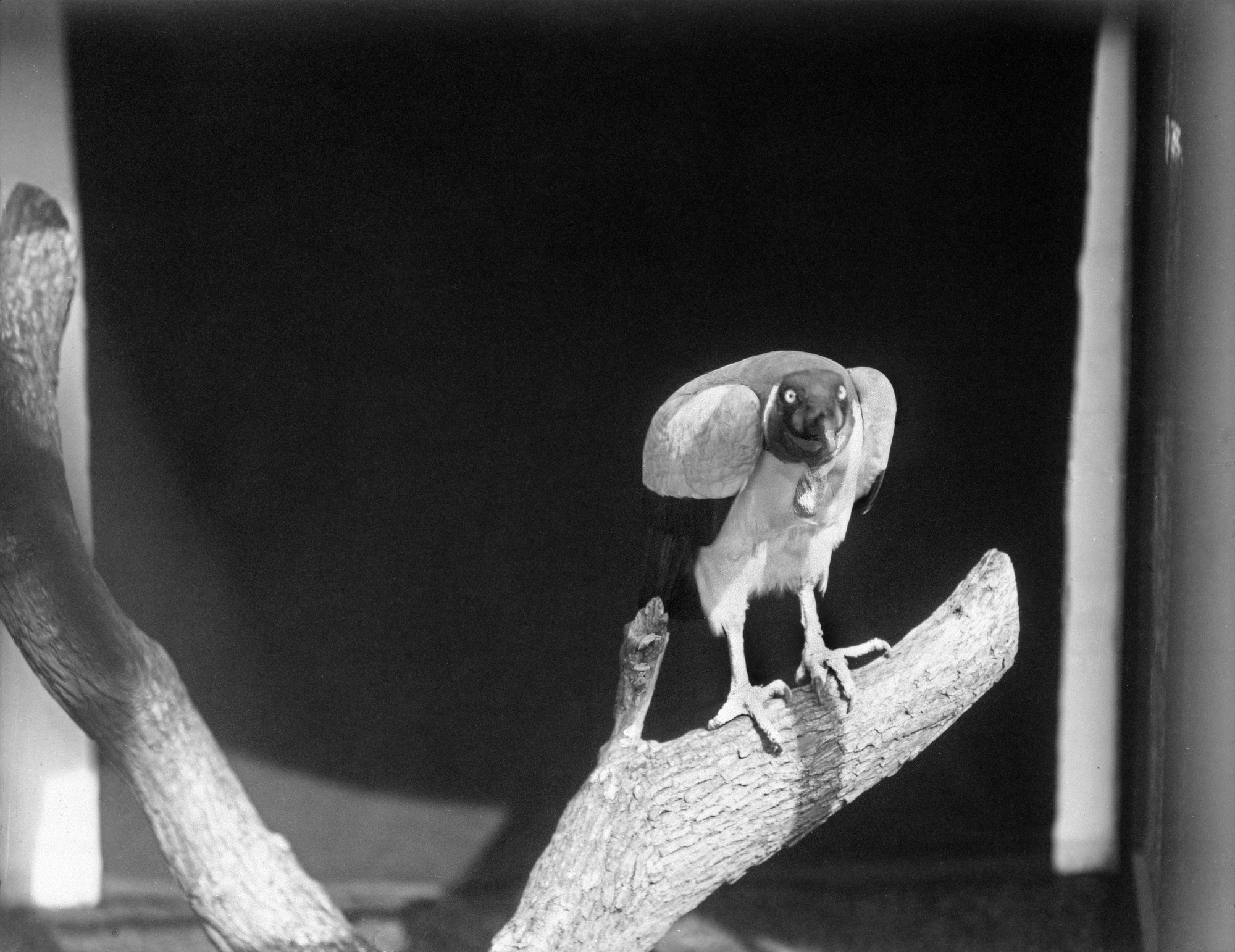 A King Vulture, sarcoramphus papa, with wings spread out sits on a tree limb in his cage at the National Zoological Park.