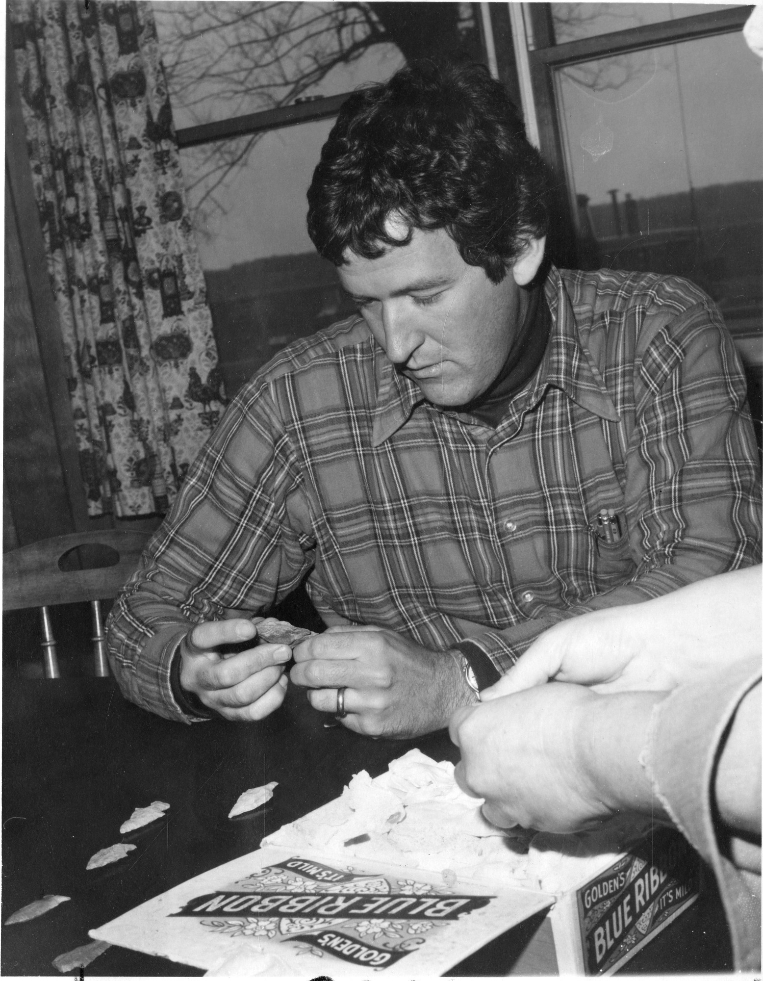 Archaeologist Bruce D. Smith of the National Museum of Natural History examines arrowheads found on a Missouri farm. He holds an arrowhead in his hands and several arrowheads are laid out on the table. Smith directed an intensive study in the 150-square-mile Southeastern region of Missouri that surrounds the Peter Bess mound.