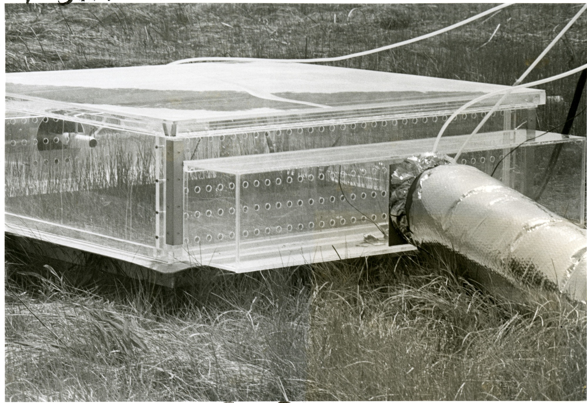 Measuring marsh grass productivity in this Plexiglas box. The production of energy in a salt marsh was investigated through a cooperative effort of two Smithsonian bureaus, with the Radiation Biology Laboratory's physiological ecologist Bert Drake and a team of his co-workers conducting research at the Chesapeake Bay Center of Environmental Studies located along the Rhode River estuary of the bay. The two bureaus were merged to become the Smithsonian Environmental Research Center.