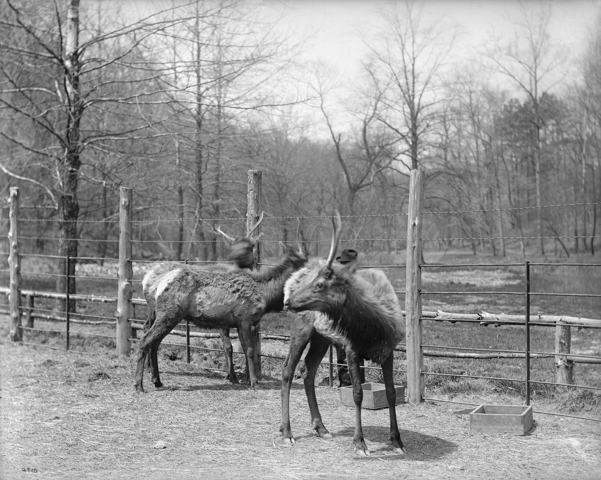 Three elk are standing near a fence in their enclosure at the National Zoological Park. A man can be partially seen standing behind the fence.
