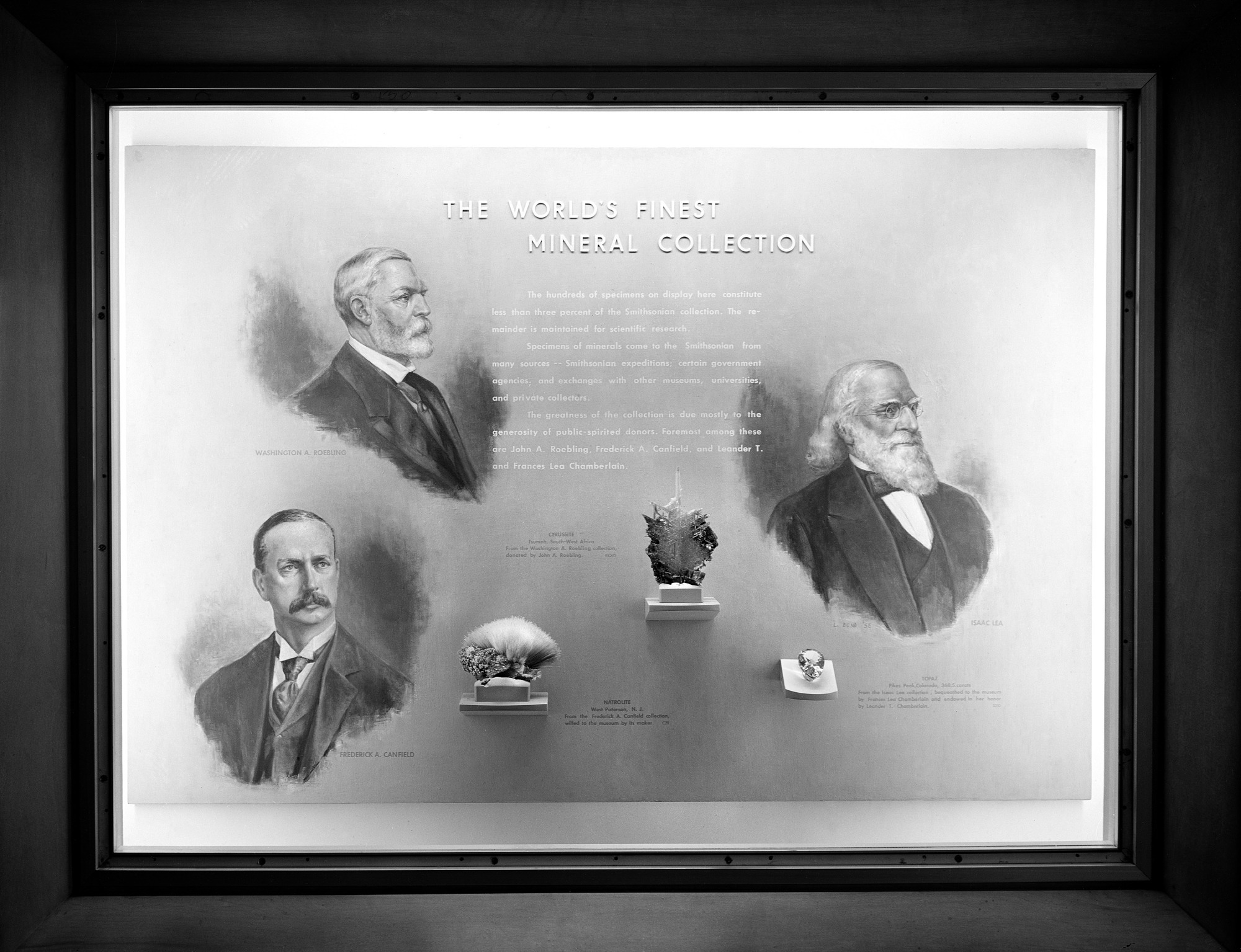 After the Exhibits Modernization Program, in the Gems and Minerals Hall in the new United States National Museum, now the National Museum of Natural History, a wall case acknowledges the contribution by public-spirited donors' Washington A. Roebling, Frederick A. Canfield and Leander T. and Frances Lea Chamberlain with photo images of Washington A. Roebling, Frederick A. Canfield and Isaac Lea. Also in the case is a specimen from each of their collections.