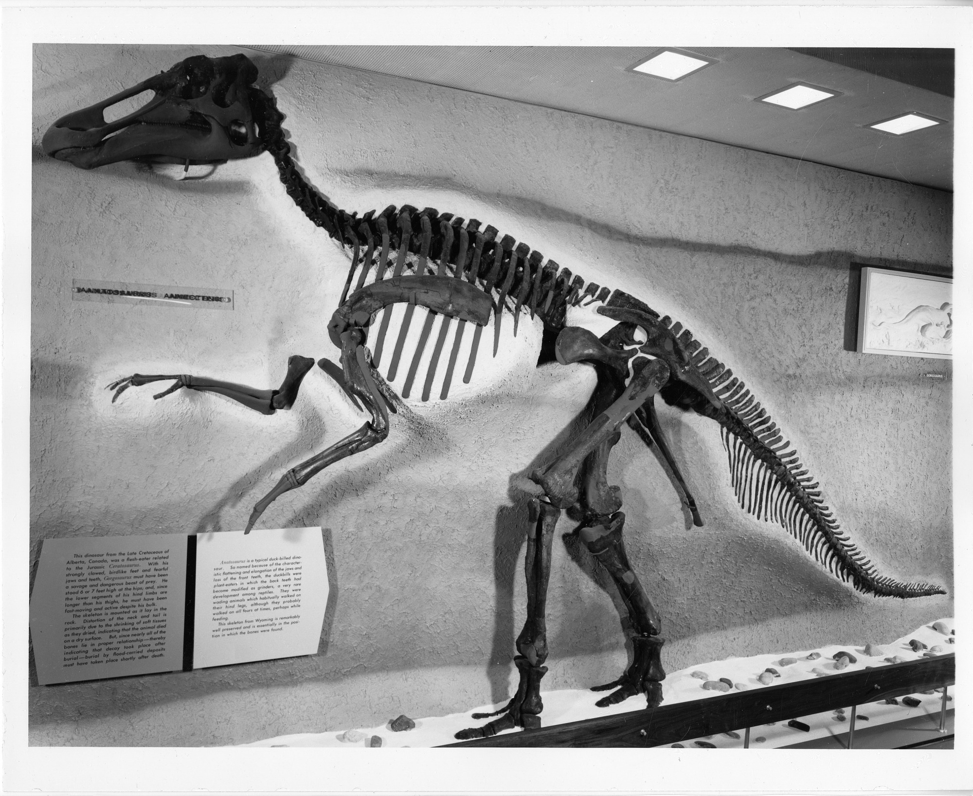 The Fossil Reptiles Exhibit opened in June 1963 in the United States National Museum, now the National Museum of Natural History, as part of the Exhibits Modernization Program. This section of the exhibit displays a skeleton of an Anatosaurus, a typical duck-billed dinosaur from the Late Cretaceous of Alberta, Canada.