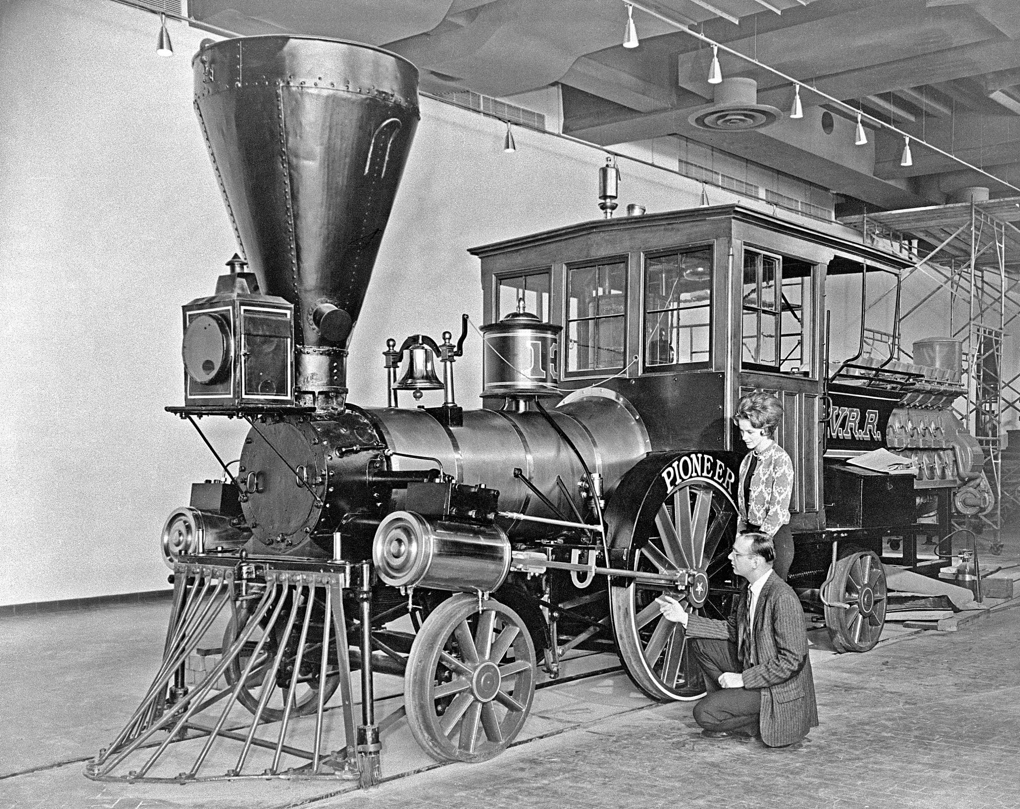 Early passenger locomotive, the "Pioneer," built in 1851 for the Cumberland Valley Railroad Company of central Pennsylvania. It regularly pulled three and four-car passenger trains at speeds of 40 mph. After being damaged in a raid by J. E. B. Stuart in 1862, it was repaired and continued to be in use until 1901. Curator John H. White and secretary Mary S. Chroniger are checking the final installation of the "Pioneer." This exhibit is part of the Hall of Rail Transportation in the Museum of History and Technology, now the National Museum of American History.