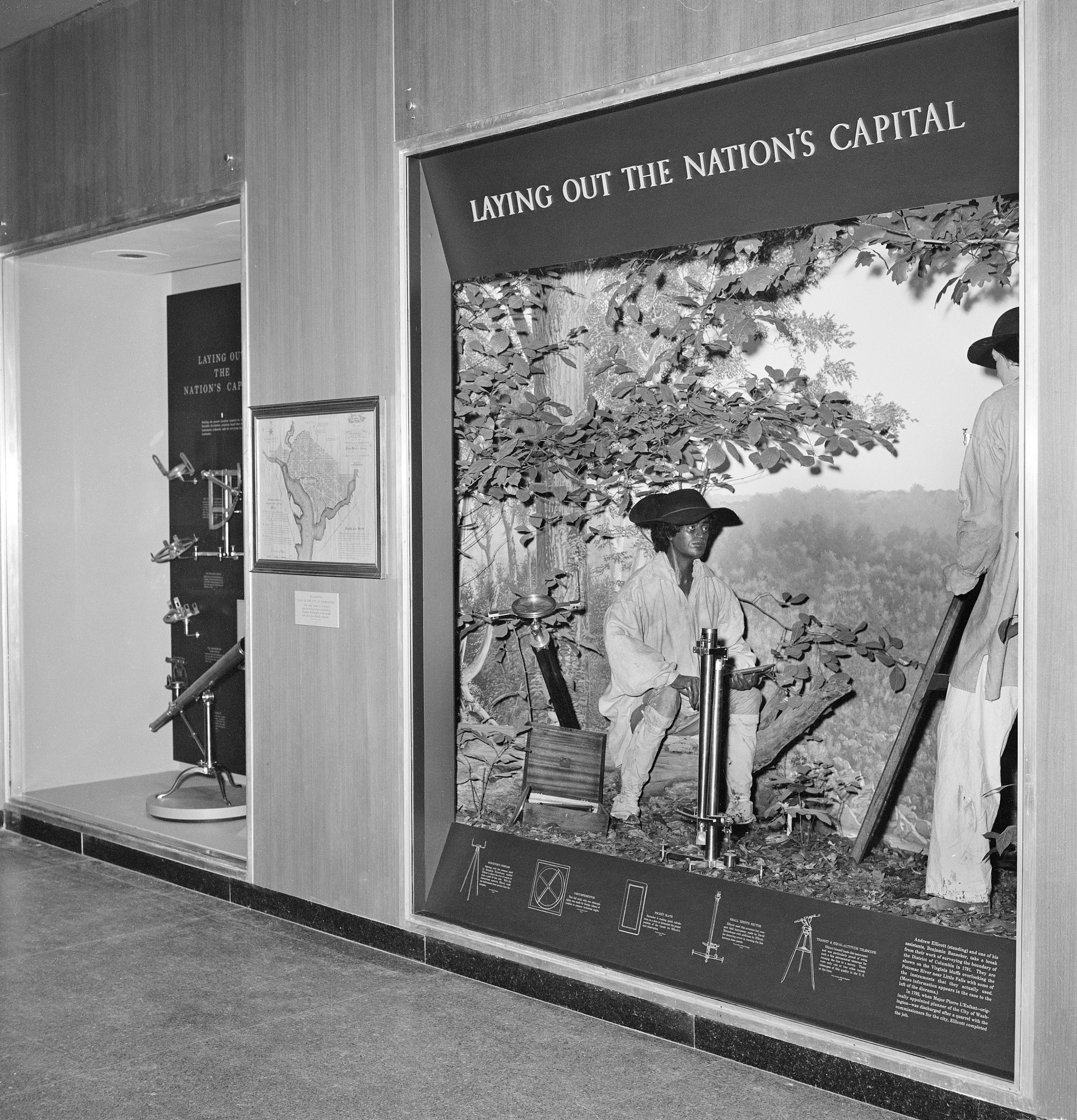 A diorama of Andrew Ellicott and his assistant Benjamin Banneker taking a break from surveying the boundaries of Washington, D.C., in "Laying out the Nation's Capital" in the Hall of Physical Sciences. To the left of the diorama is an exhibit of various instruments used. The exhibit opened in March 1966 in the National Museum of History and Technology, now the National Museum of American History.