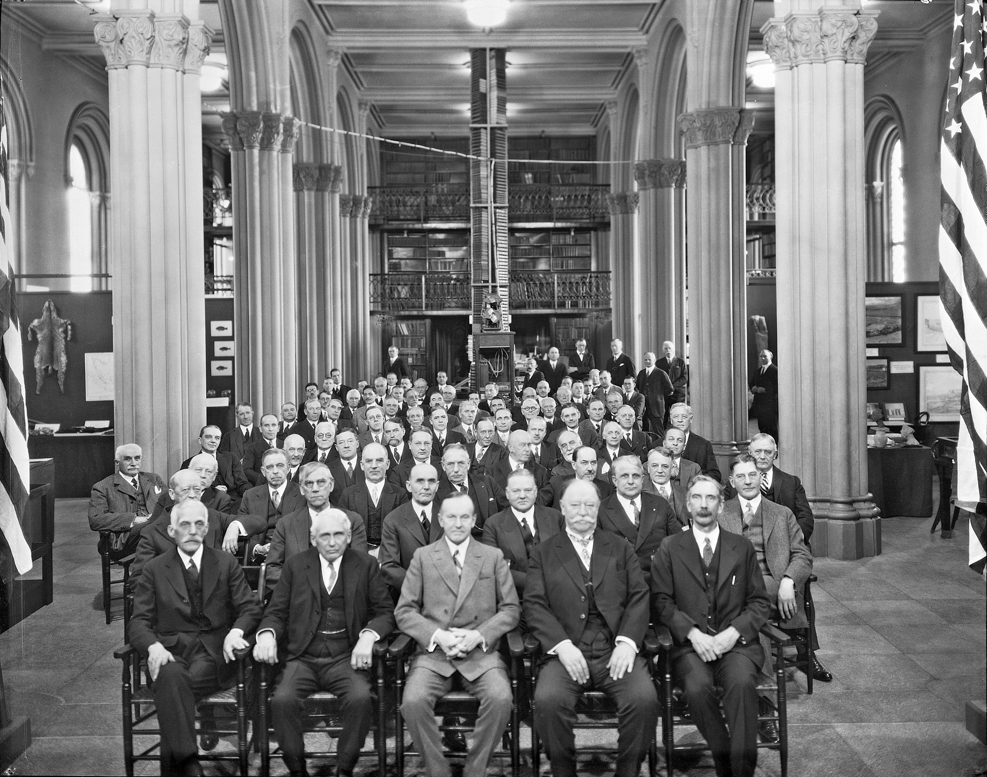 - Gathering in the Great Hall of fifty leaders of the scientific, political and industrial life of the country at a conference held at the Smithsonian Institution in February, 1927. In the front row, left to right: Secretary of the Treasury, Andrew Mellon; Secretary of State, Frank B. Kellogg; President Calvin Coolidge; Chief Justice William Howard Taft; and Acting Secretary of the Smithsonian, Charles Greeley Abbot. Second row: Senator Jesse Houghton Metcalf; Senator Reed Smoot; W. H. Jardine; H. Hoover; J. J. Davis; C. D. Wilbur. Third row: W. H. Welch, H. Work, W. W. Campbell; Henry Fairfield Osborn; John C. Merriam; Dwight Morrow; H. S. New. Fourth row: C. F. Brush; I. B. Laughlin; F. Walcott; C. Hamlin; Frederick A. Delano; Jesse Walter Fewkes; J. Tamblyn. Fifth Row: G. E. Vincent; H. M. Robinson; E. B. Parker, Charles F. Choate; E. W. Gifford; S. Flexner; J. G. Sargeant.