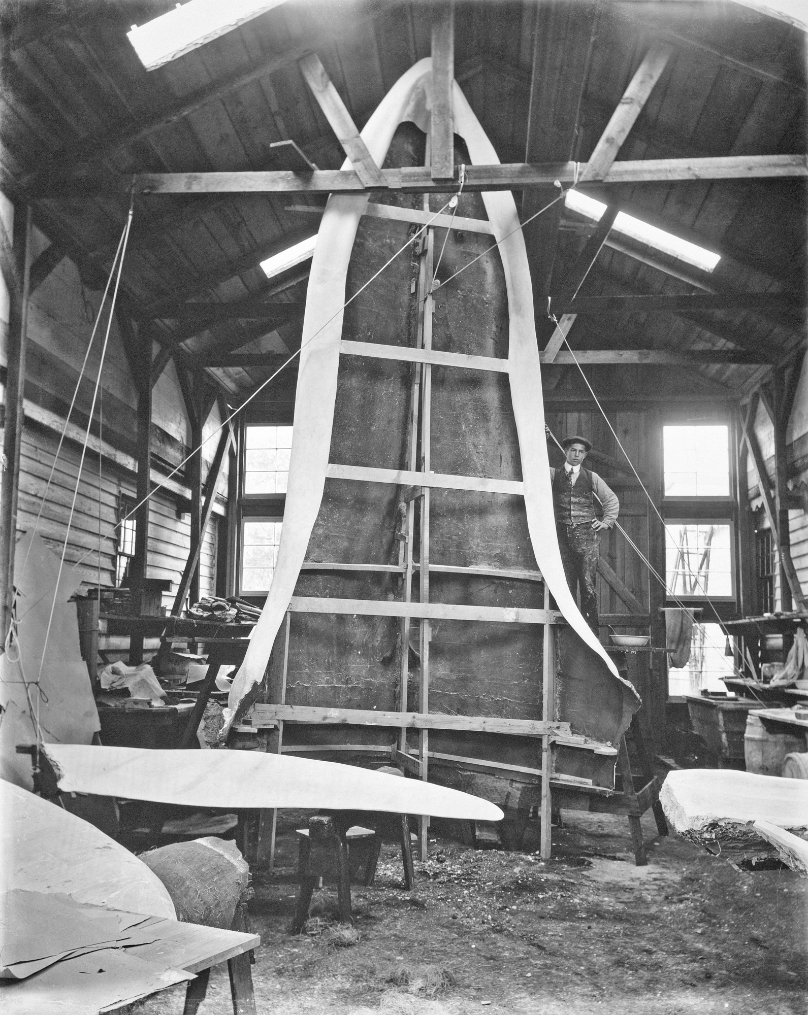 A worker stands beside a model, probably of a whale, that is probably being prepared for an exhibit in the United States National Museum. The location is the workshop is unknown.
