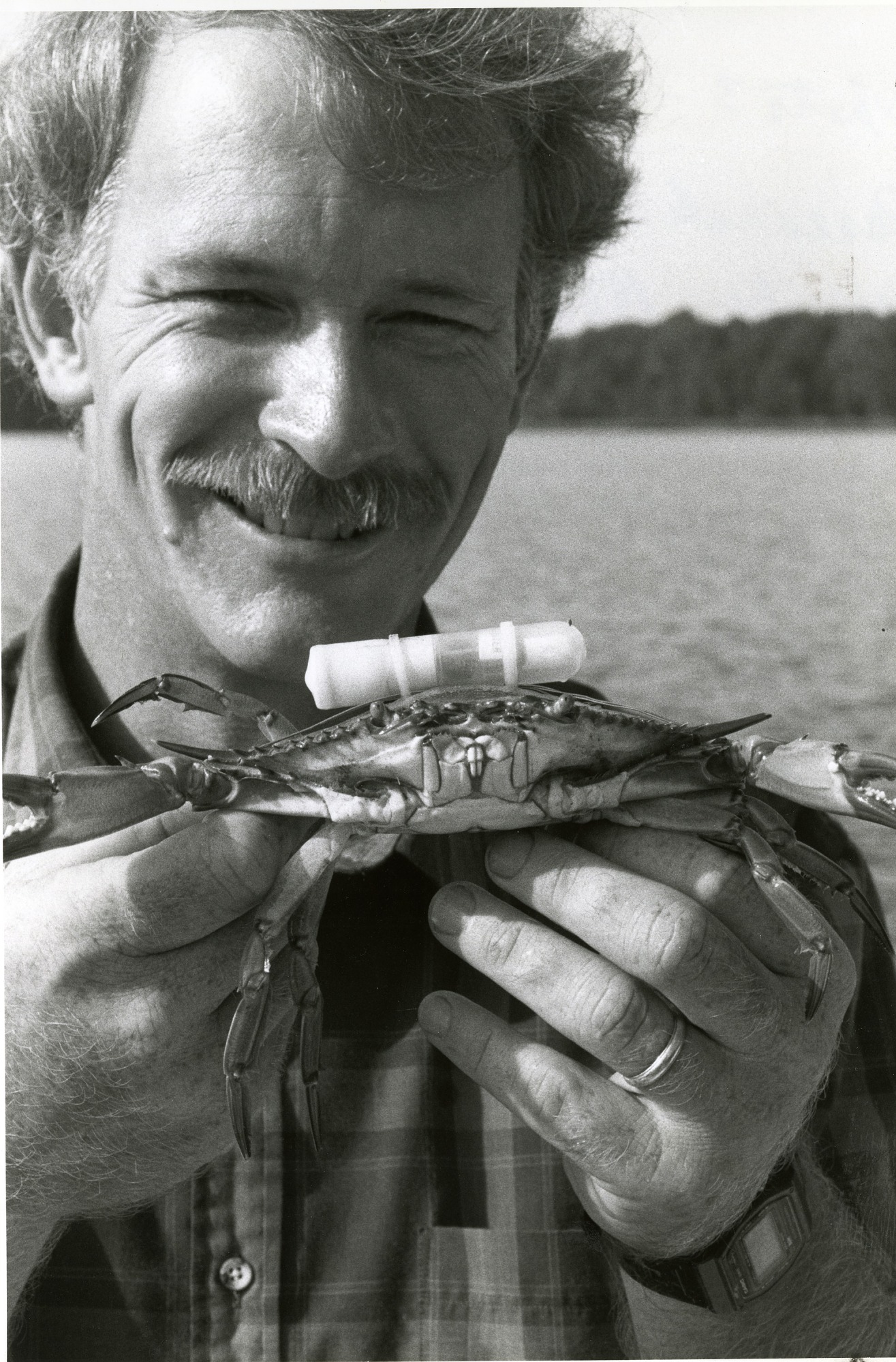 A lightweight ultrasonic telemeter attached across the top shell of this Atlantic blue crab enables Dr. Anson Hines of the Smithsonian Environmental Research Center to track its movements after it is released into the Rhone River, a sub-estuary of the Chesapeake Bay.