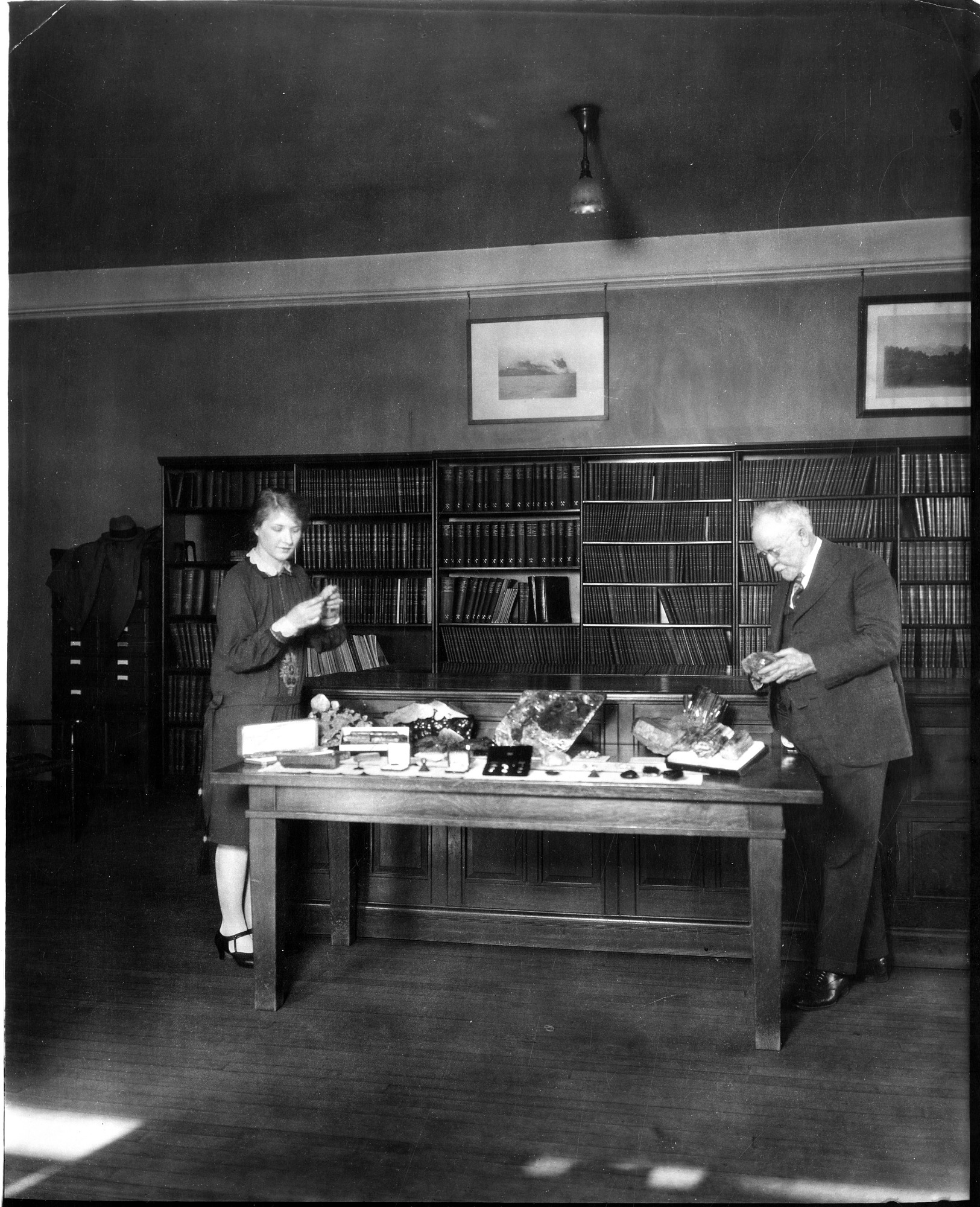 Merle Crisler Foshag and George P. Merrill, of the Department of Geology, United States National Museum at the Smithsonian, examining specimens from the collection of minerals received from Washington A. Roebling's son, John A. Roebling in 1926.