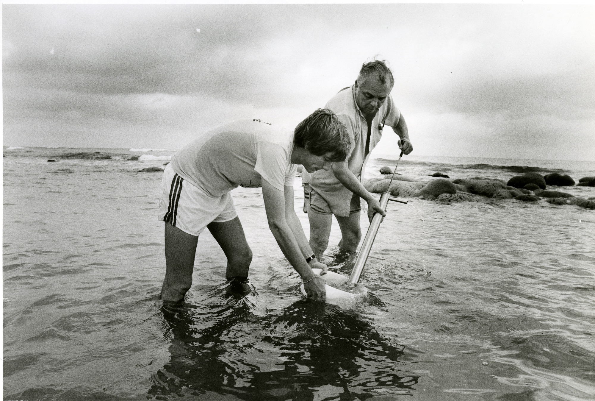 Dr. Raymond B. Manning (right), of the Department of Invertebrate Zoology in the National Museum of Natural History, and William D. Lee, Smithsonian Marine Station research assistant, use a "slurp" gun to search for stomatopods, a type of marine crustacean, at an inlet near the Smithsonian Marine Station (SMS) at Fort Pierce, Florida.