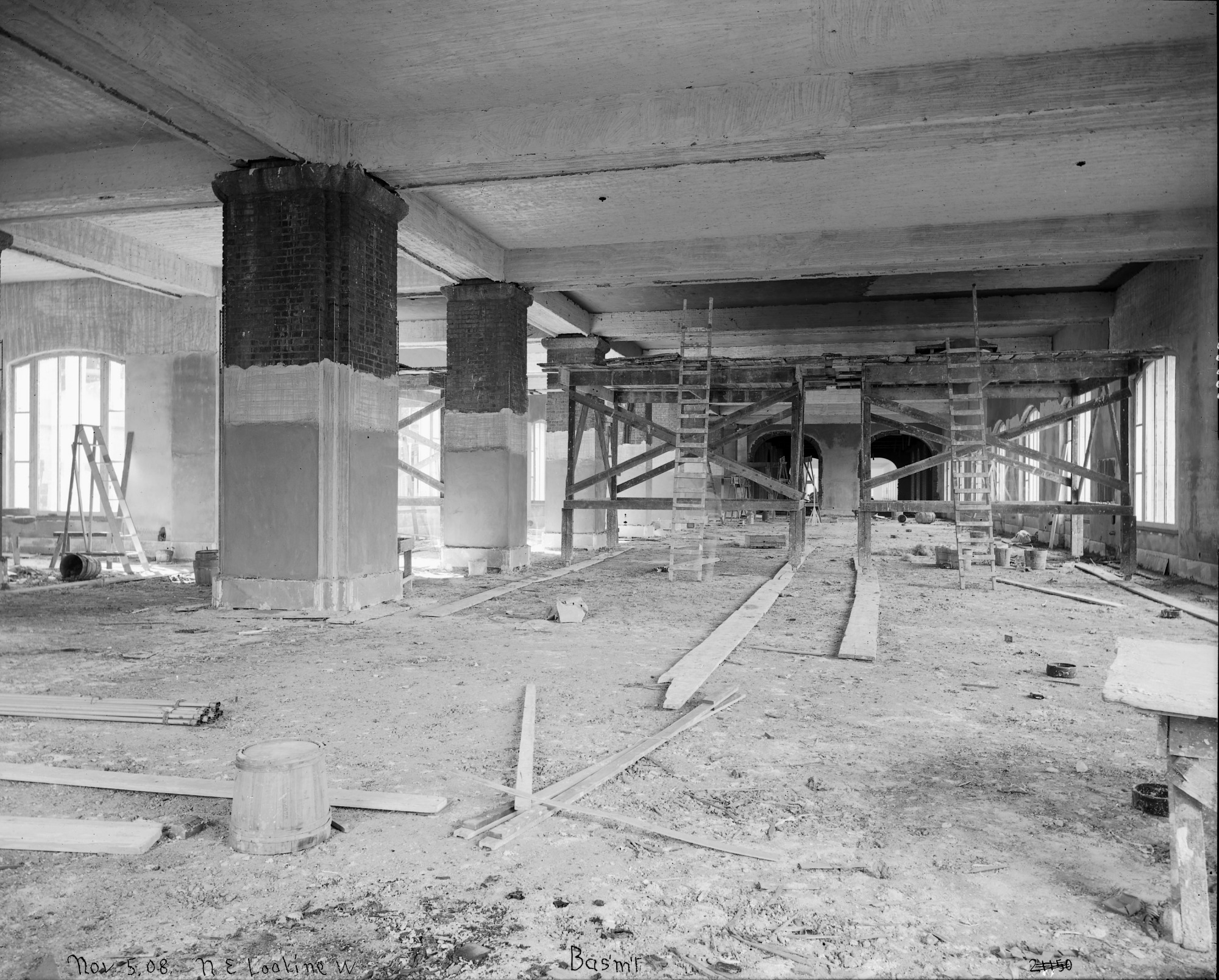 Construction of the basement of the National Museum of Natural History on November 5, 1908. The brick support columns are in the process of being covered. Around the basement are two wooden platforms, ladders, pails and wooden planks.