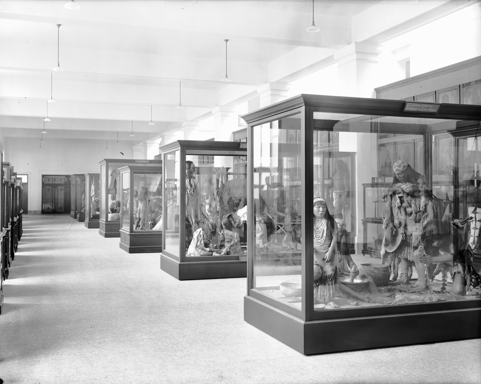 Exhibit hall located in the new United States National Museum, now known as the National Museum of Natural History. There are exhibit cases lined up with life groups of Native Americans. In the foreground the case is labeled "California Province; Family Group of Hupa Indians." Portraits of Native Americans are hung on the wall behind the exhibit cases.