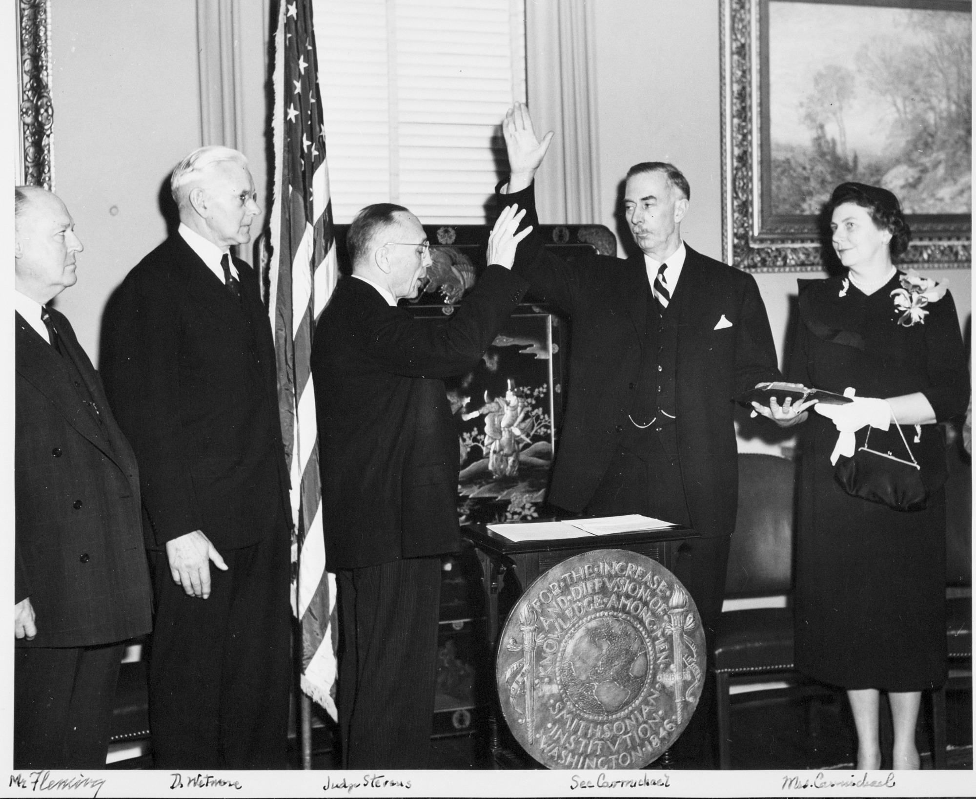 Swearing in of the seventh Secretary of the Smithsonian Leonard Carmichael (1953-1964) on January 2, 1953, with (l-r) Regent Robert V. Fleming, Alexander Wetmore (sixth Secretary of the Smithsonian, 1944-1952), Chief Judge of U.S. Court of Appeals Harold M. Stephens, Leonard Carmichael, and Mrs. Pearl Carmichael. Chief Justice Fred M. Vinson was unable to attend the ceremony due to a death in his family, so Stephens filled in.