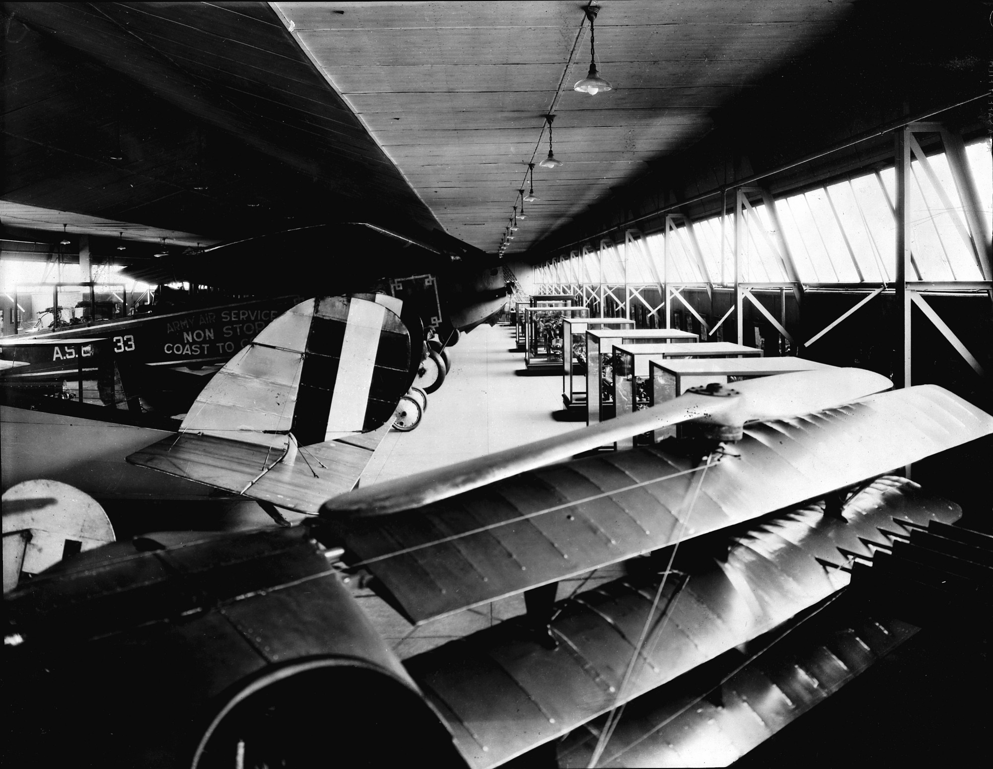 Interior of National Air Museum's Aircraft Building, located in South Yard behind the Smithsonian Institution Building, shows planes including an Army Air Service Non Stop Coast to Coast plane and display cases. The National Air Museum was established on August 12, 1946 and was housed in a temporary metal building dating from World War I. The building remained there until it was demolished in 1975 in preparation for the Victorian Garden, the Bicentennial Celebrations and the new National Air and Space Museum, which opened in 1976.