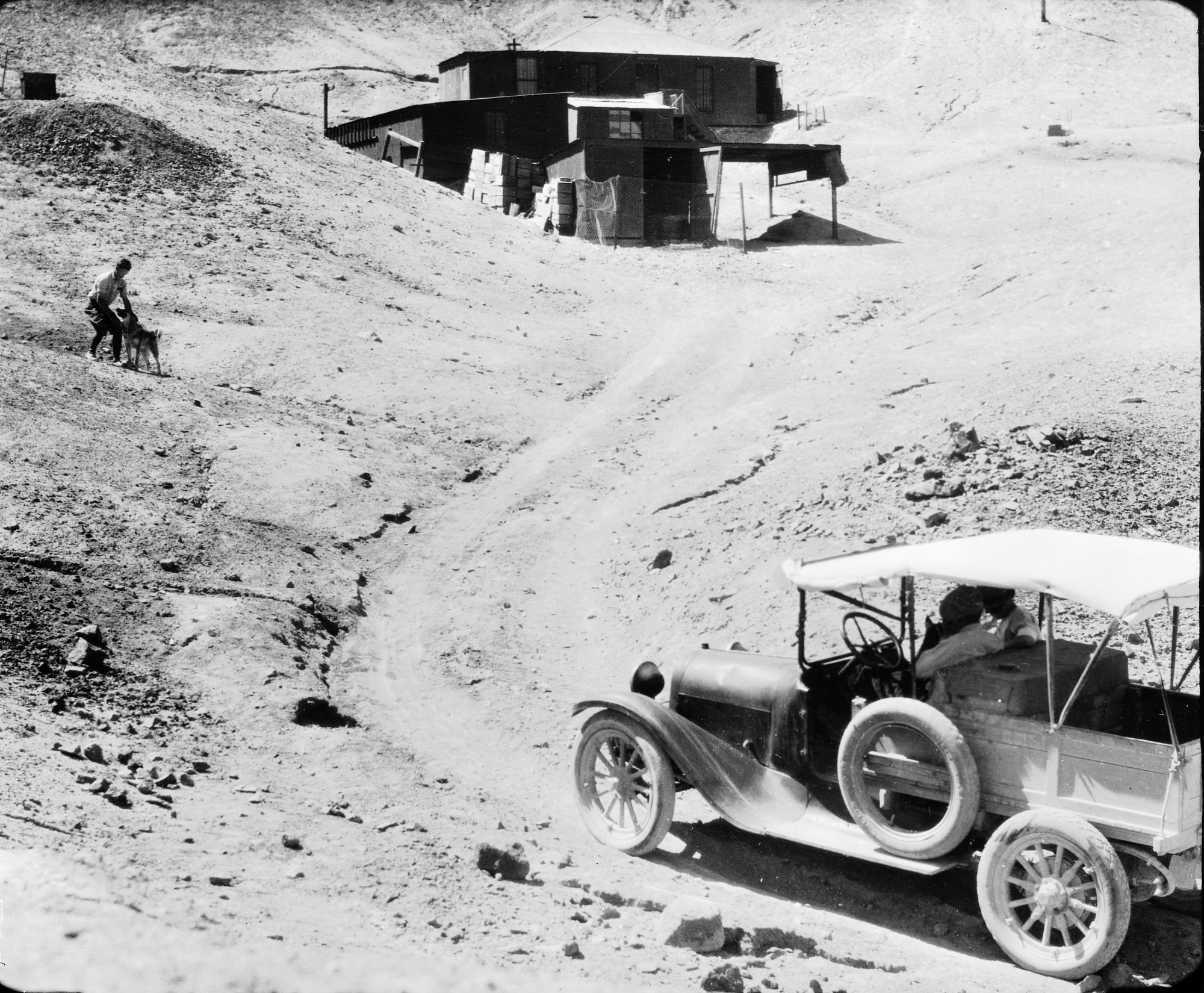 Loyal B. Aldrich, who worked for SAO from 1908-1956 and was its director from 1944 to 1955, and others outside the living quarters of the Smithsonian Astrophysical Observatory solar station. The solar station operated from 1920 to 1955 at Mt. Montezuma, Chile. Two men are seated in an automobile and one man is petting a dog.