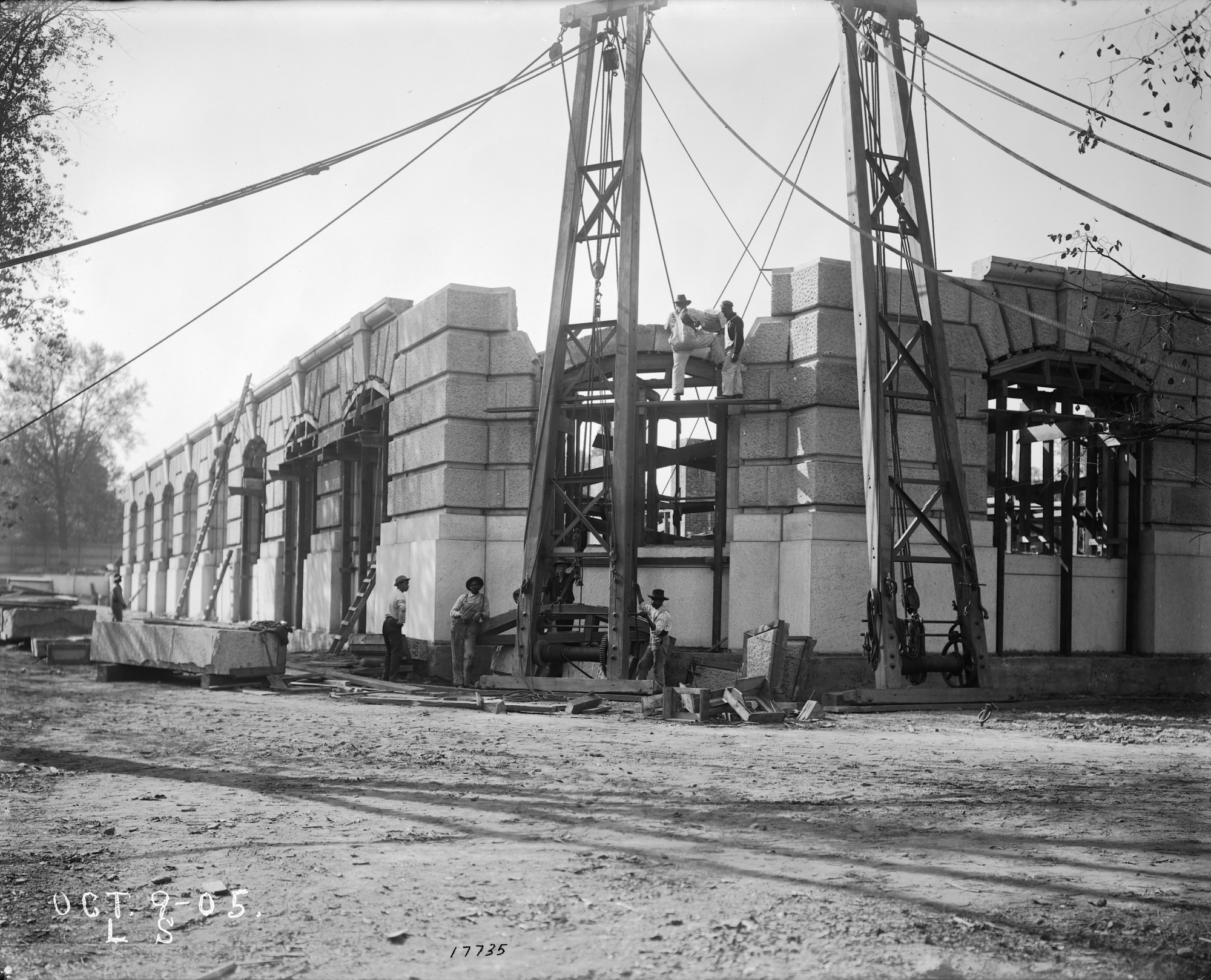 Construction of the exterior wall of the U.S. National Museum Building, now known as the National Museum of Natural History, looking south on October 9, 1905. The first story of windows are in place and workers are working on an arch over one of them.