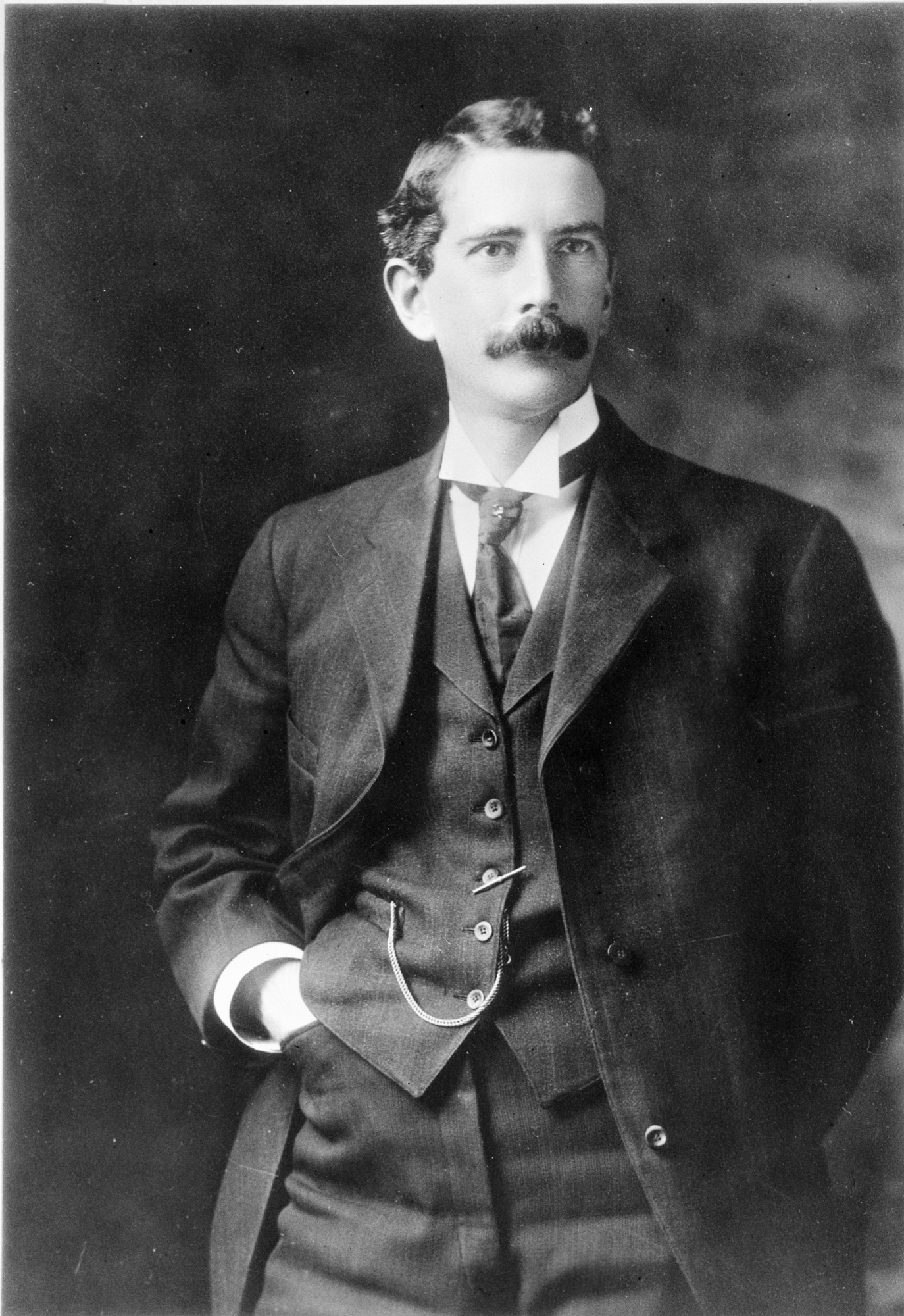 Formal portrait of Charles Greeley Abbot, as a young man. He later served as the fifth Secretary (1928-1944) of the Smithsonian Institution. Abbot is seen here standing, facing the camera with his hand in his left front pants pocket.
