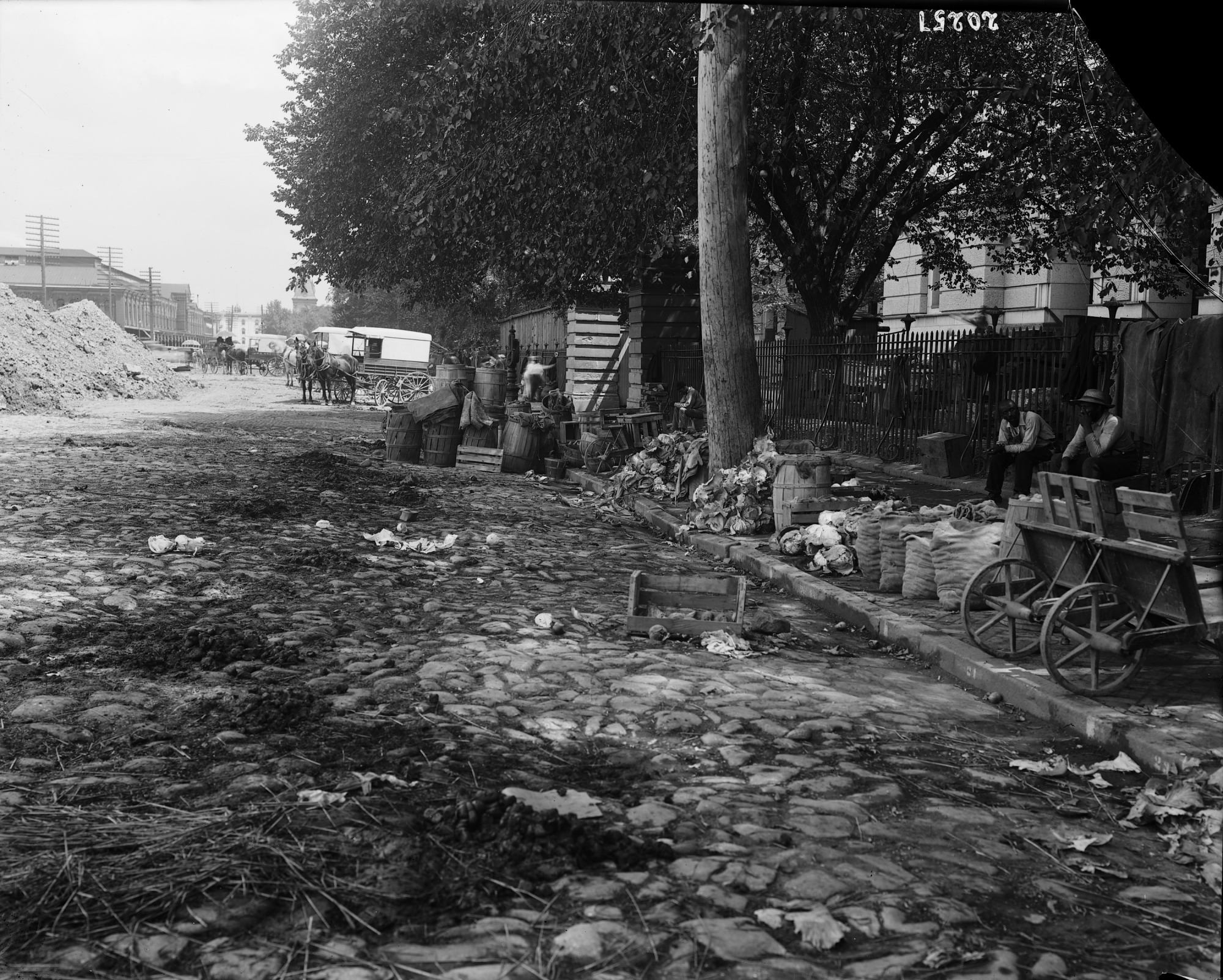 The Center Market outside the United States National Museum Building, now the National Museum of Natural History, on what is now known as Constitution Avenue on August 13, 1907. Produce vendors have set up next to the wrought iron fence of the Museum, actually incorporating space on the fence to vend. The street is cobbleston and there are horse drawn carts on it.
