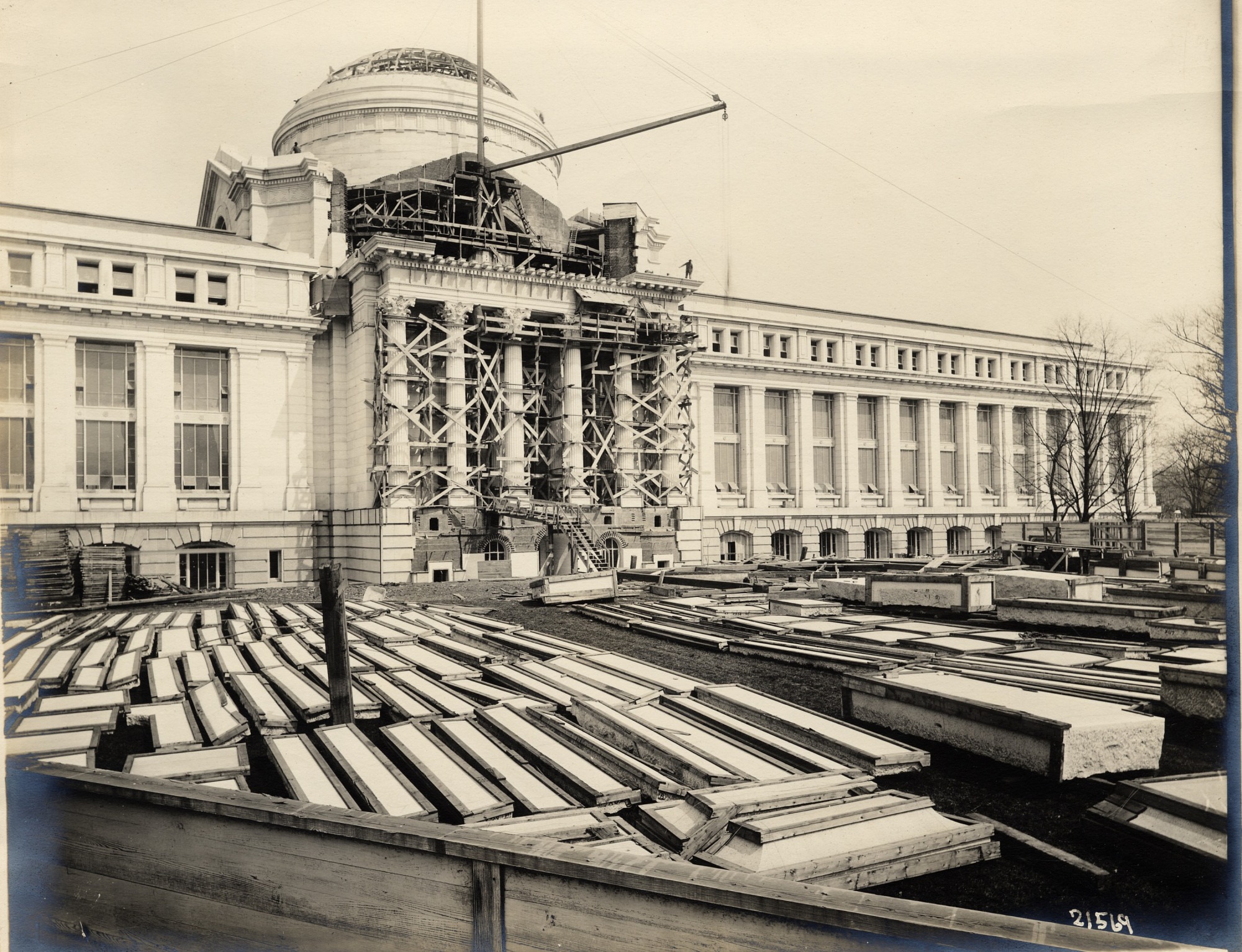 Construction work on the south front of the National Museum of Natural History on March 27, 1909. The dome is partially completed, the columns have scaffolding, and the stairs have not been constructed. The stone slabs for the stairs have been placed in the front of the building.
